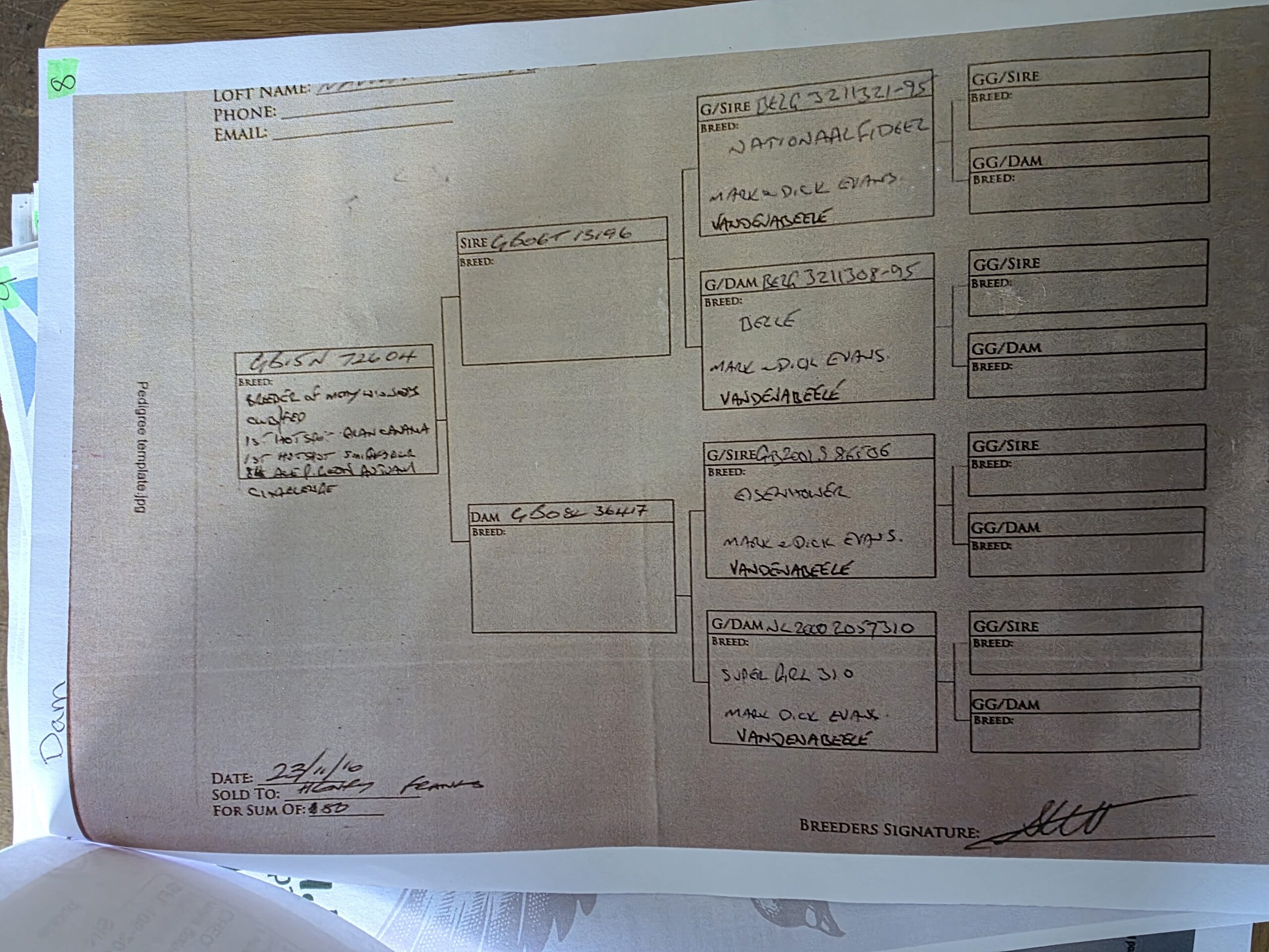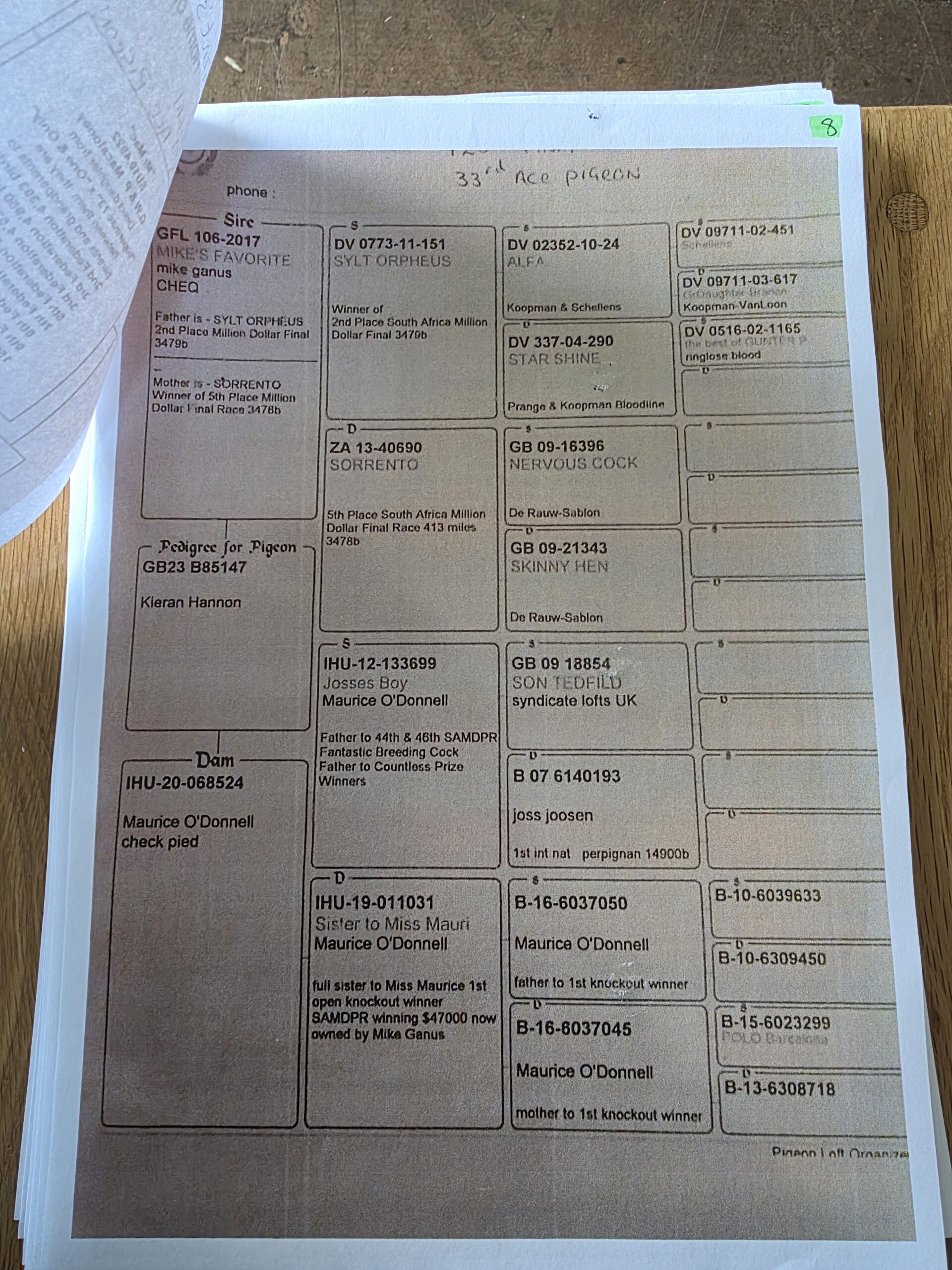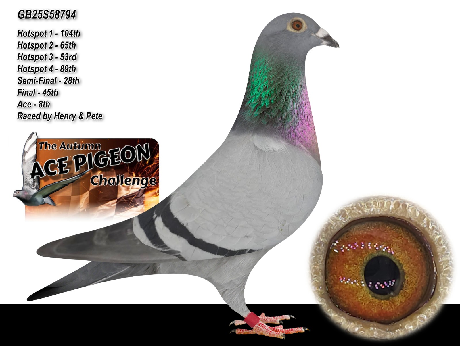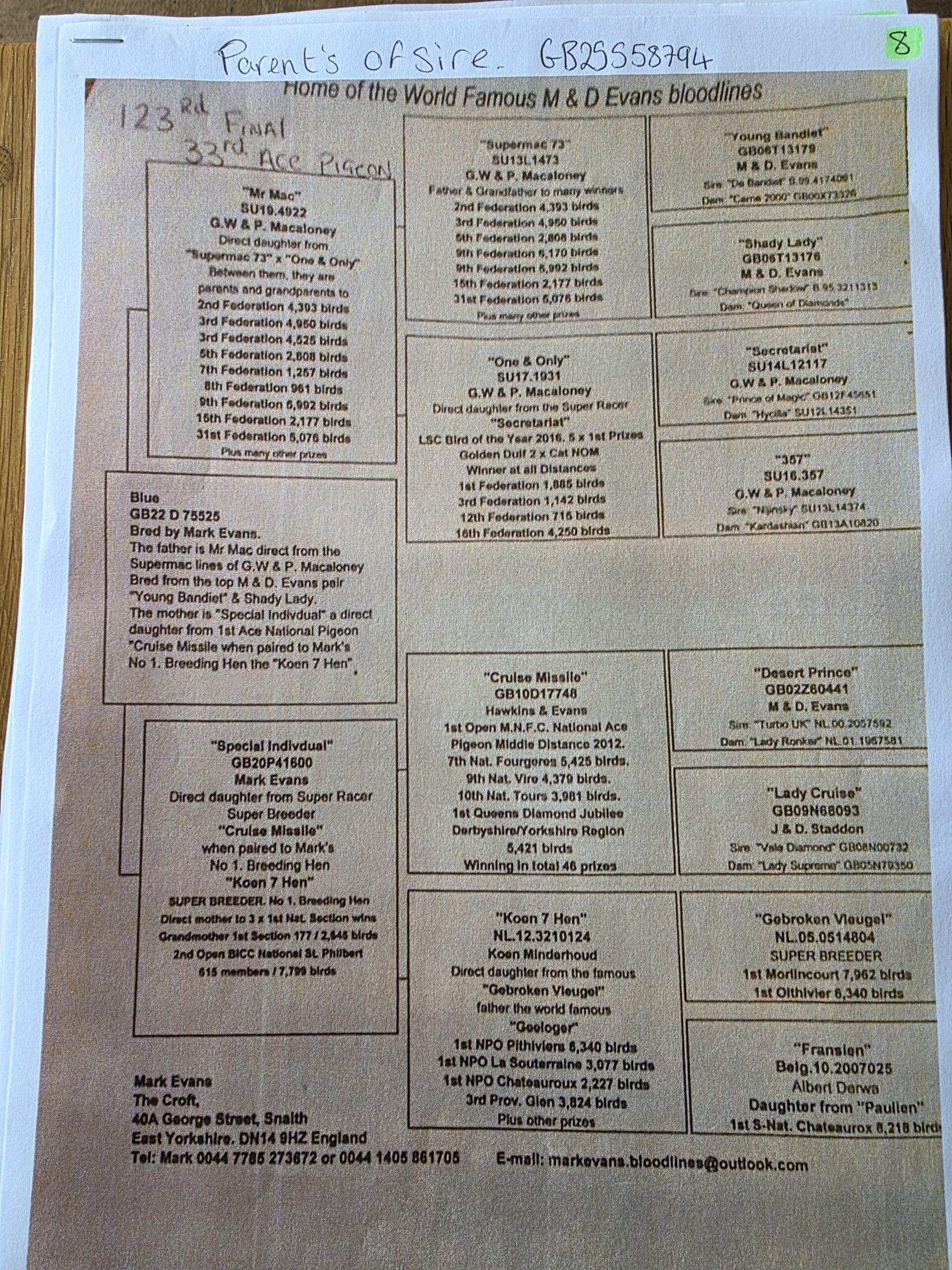 GB 25 S58794 winner of 8th ACE PIGEON AUTUMN CHALLENGE RACE for ‘Henry & Pete’ there are 3 pedigrees with this lot and so we will try to get the breeding correct.