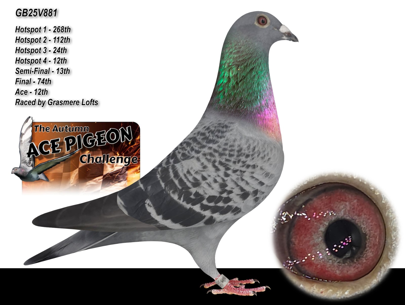 GB 25 V00881 “Grassmere 881” winner of 12th ACE PIGEON AUTUMN CHALLENGE RACE for ‘Grasmere Lofts’