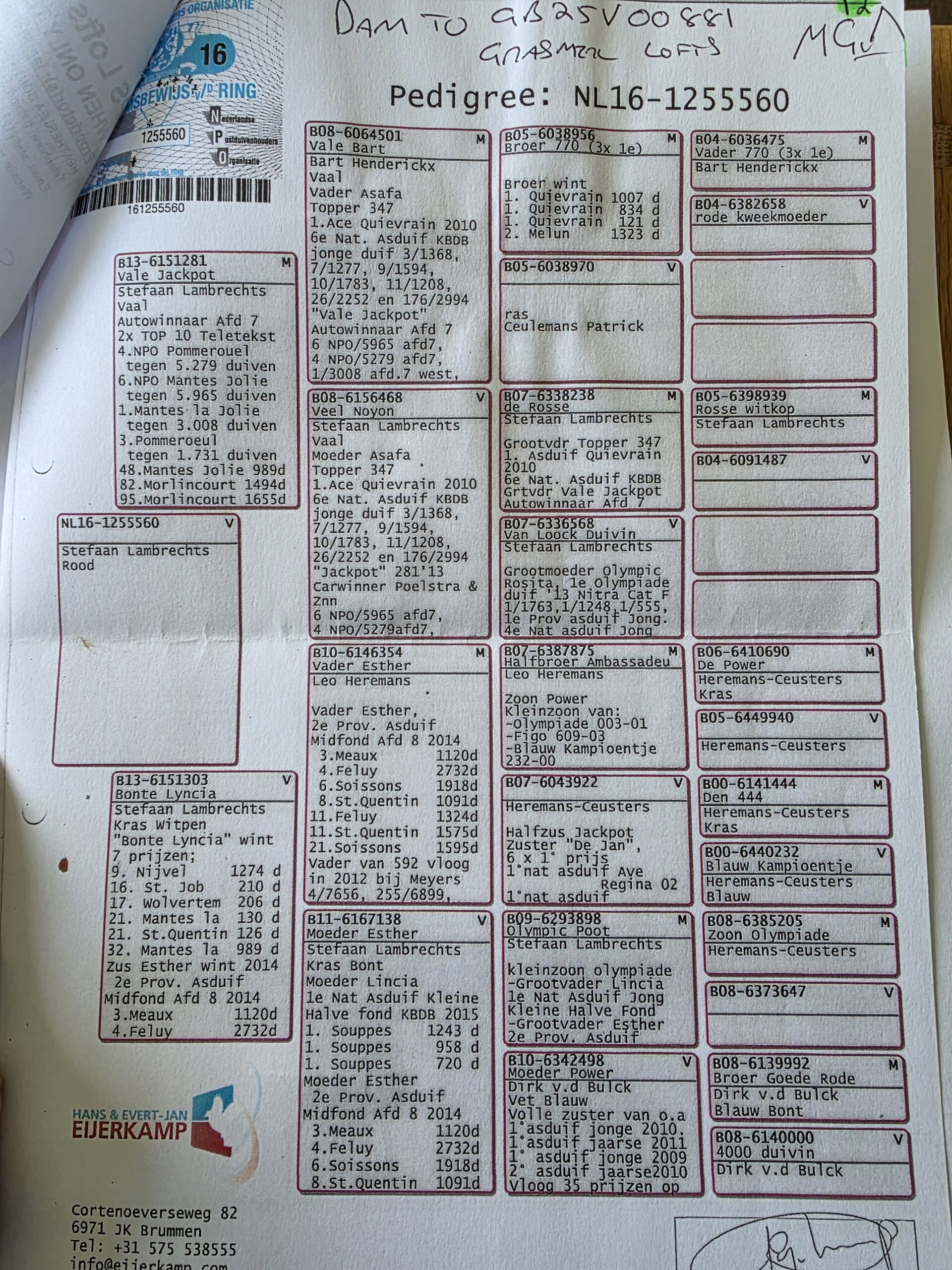 NL 16 1255560 bred by Hans & Evert-Jan Eijerkamp; she is a direct daughter from Stefaan Lambrechts “Vale Jackpot” the auto winner and top racer bred from Vele Bart and Veel Noyon.