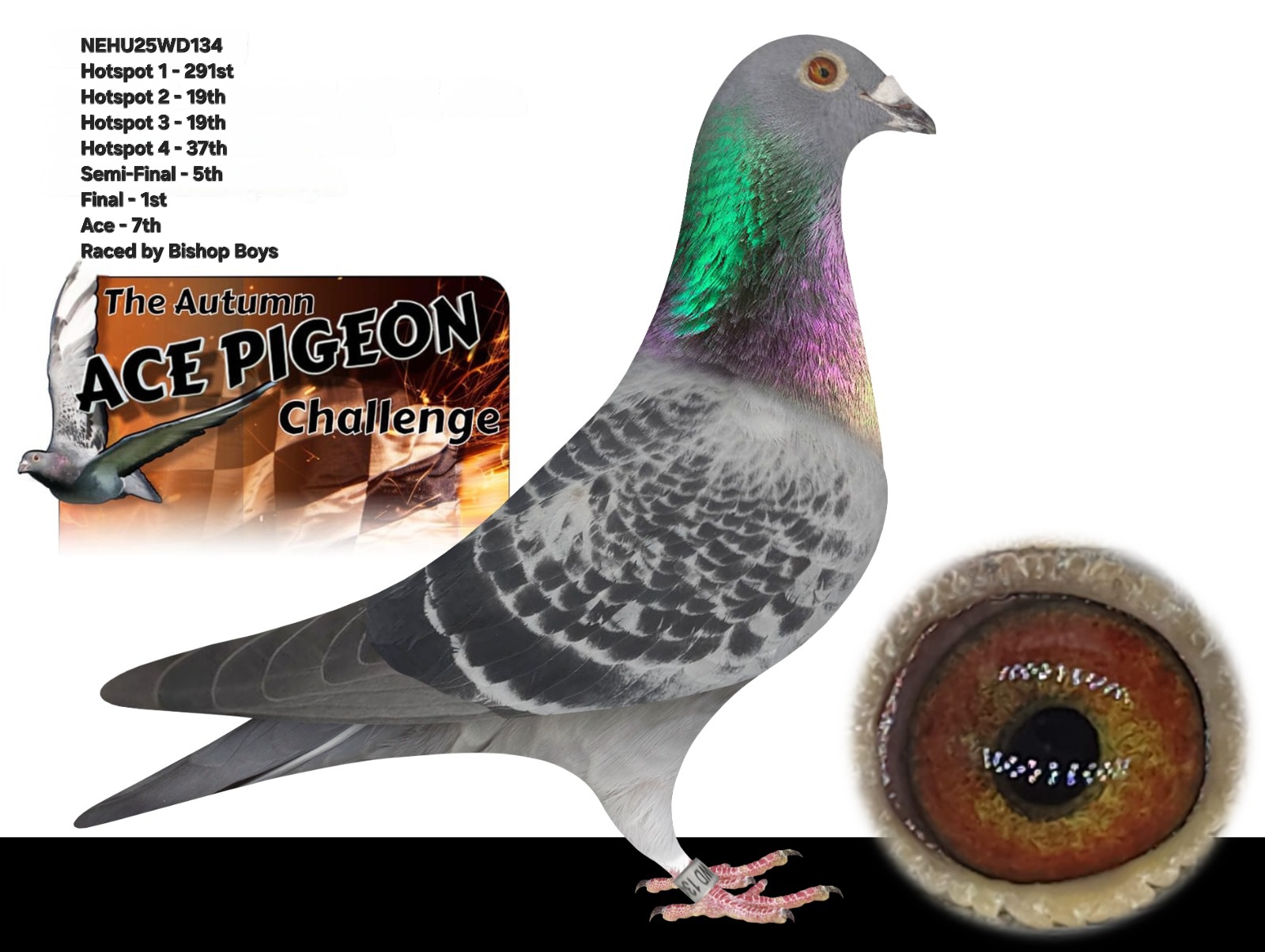 NEHU 25 WD-134 Chequer “Bishop’s 134” winner of 7th ACE PIGEON AUTUMN CHALLENGE RACE for ‘Bishop Boys’ this is their second pigeon in the first 7 Ace Pigeons and this pigeon won the Final race.