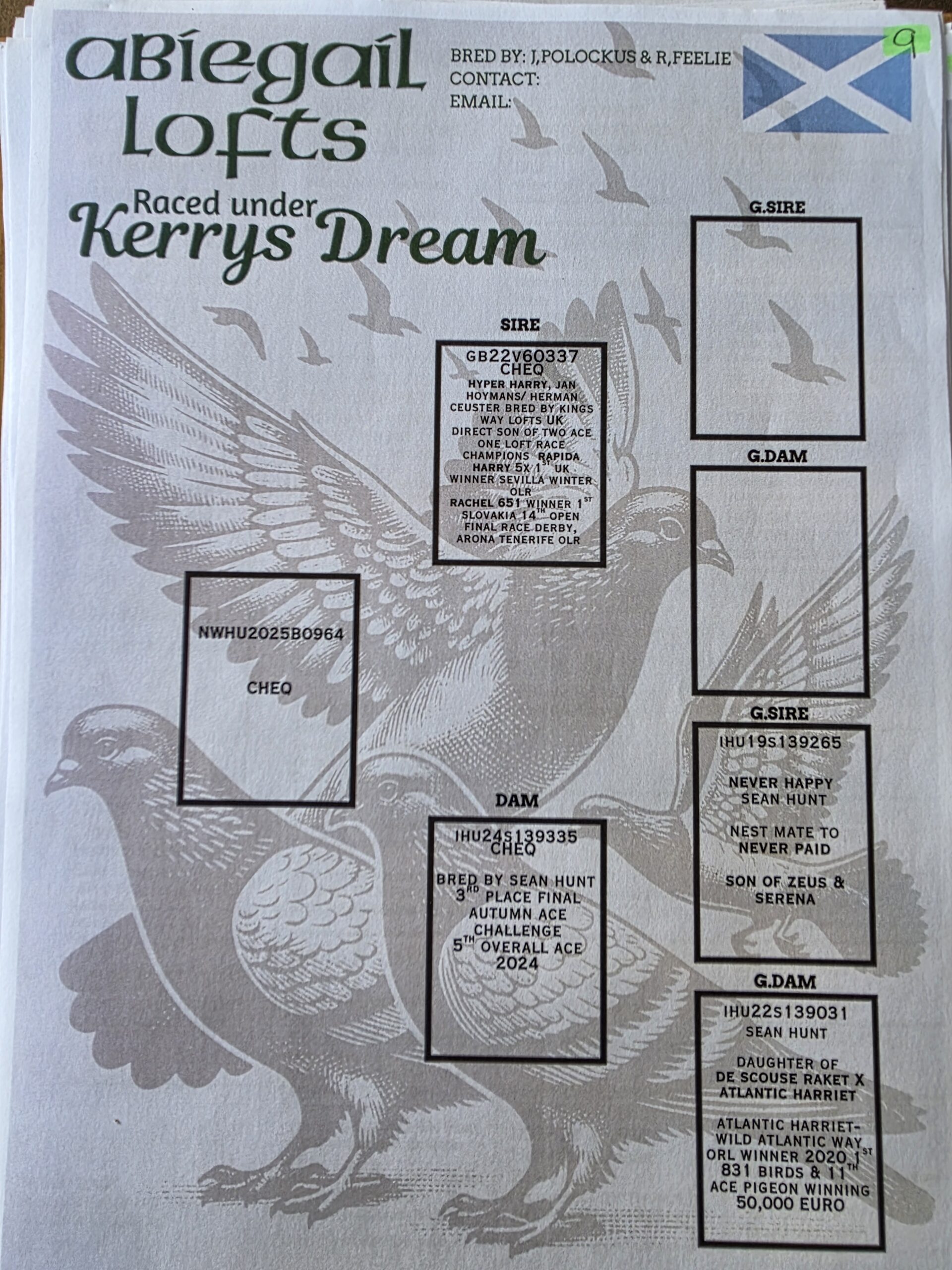IHU 24 S139335 bred by Sean Hunt and a winner of 3rd place Final Autumn Ace Challenge race 2024. Her father is “Never Happy” and her mother is a daughter of “Scouse Raket” & “Atlantic Harriet” the Wild Atlantic Way OLR winner 2020 winning 1st against 831b and 11th Ace Pigeon and 50,000 Euro.