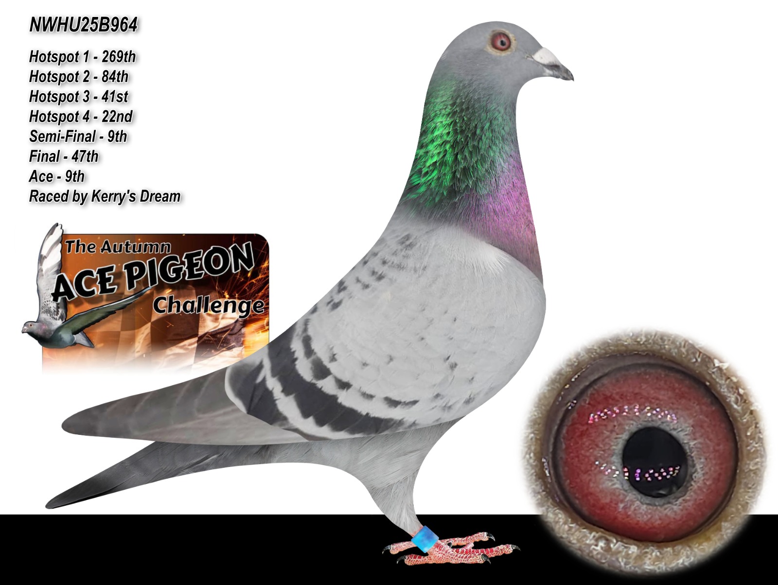 NWHU 25 B0964 Chequer “Kerry’s Dream” winner of 9th ACE PIGEON AUTUMN CHALLENGE RACE for ‘Abiegail Lofts’