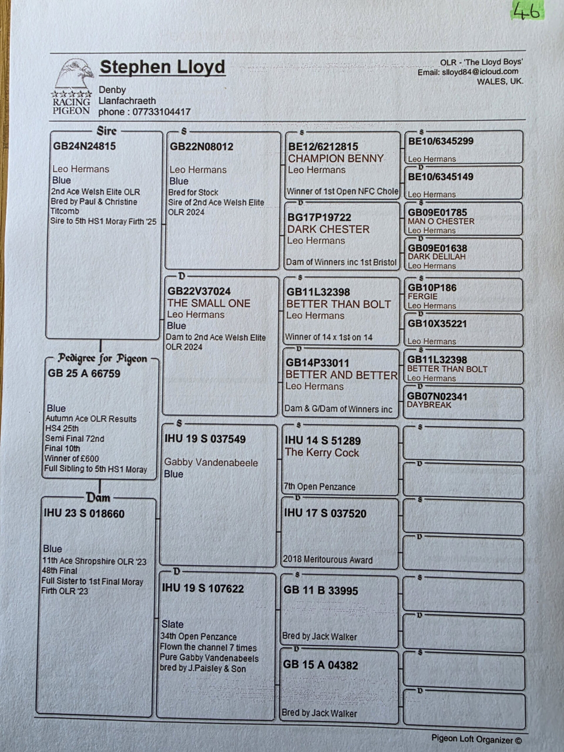 GB 24 N24815 Leo Heremans and winner of 2nd Ace Welsh Elite OLR. He was bred by Paul and Christine Titcombe, also sire to 5th HS1 in the Moray Firth OLR 2025. He is a grandson of Champion Benny, Dark Chester, Better Than Bolt and Better and Better.