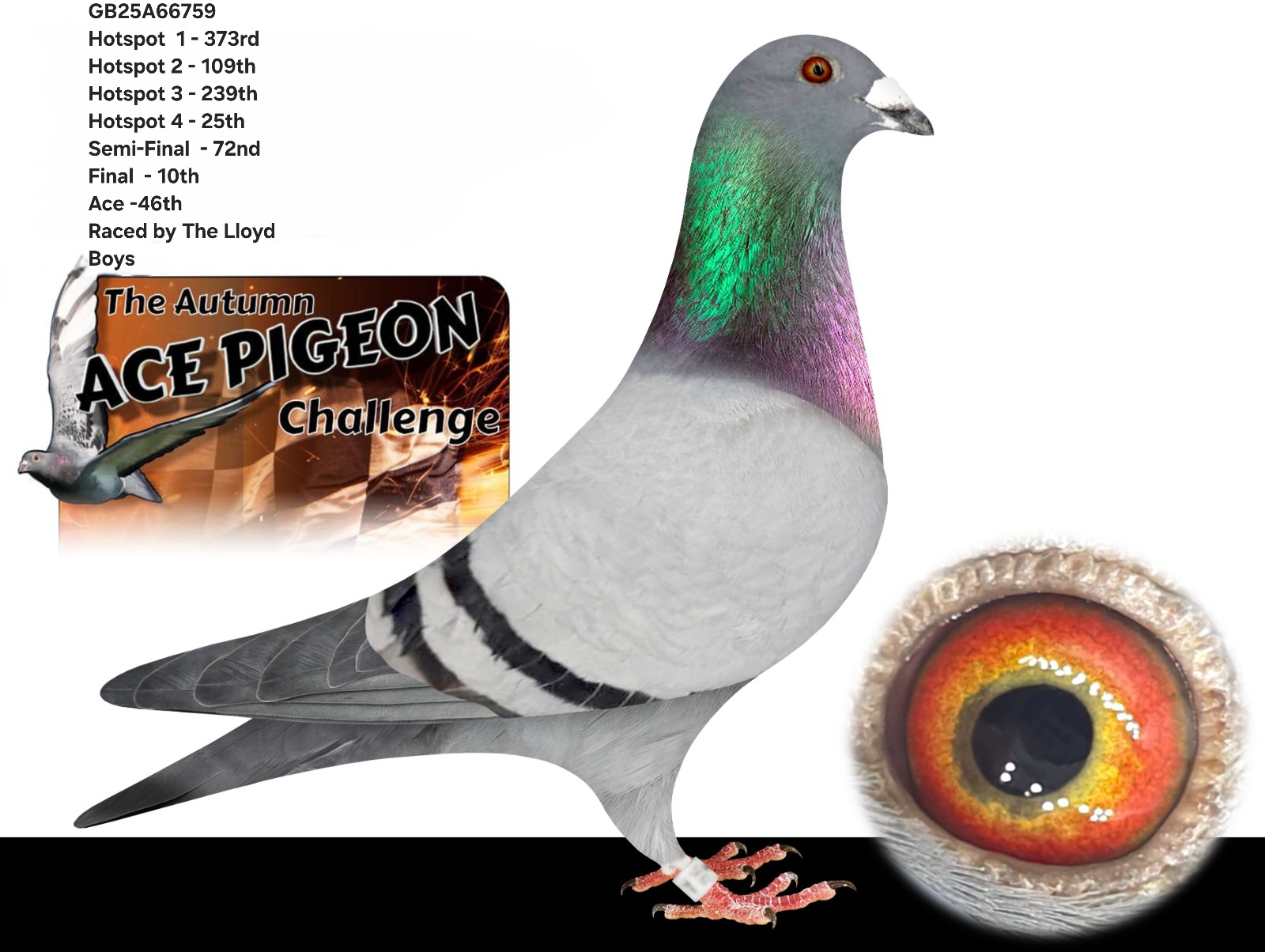 GB 25 A66759 Blue “Autumn Gold” winner of 46th ACE PIGEON AUTUMN CHALLENGE RACE and 25th HS4, 72nd Semi-Final and 10th in the final race from Bedford winning £600. Entered by ‘The Lloyd Boys’