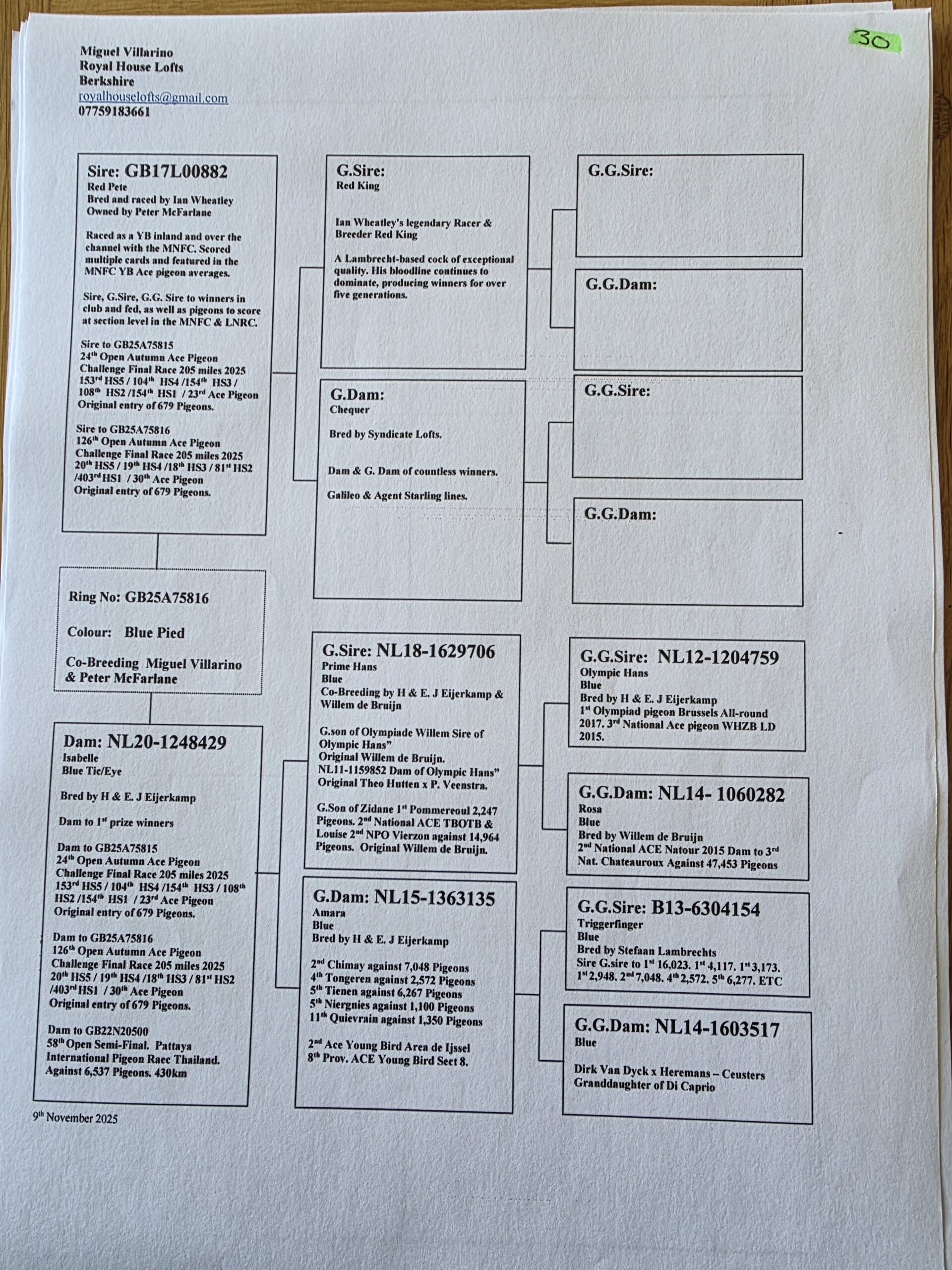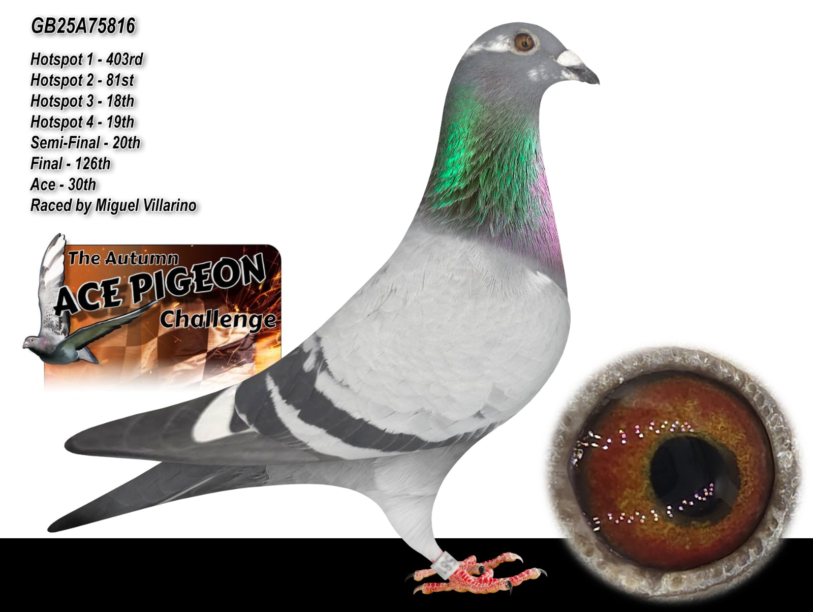 GB 25 A75816 Blue Pied “The Co-Bred 16” winner of 30th ACE PIGEON AUTUMN CHALLENGE RACE and this is a result of Co-breeding between Miguel Villarino and Peter McFarlane.