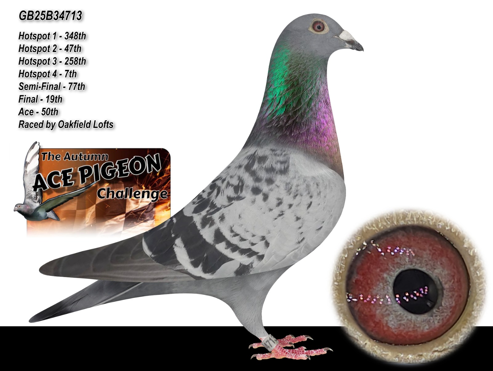 GB 25 B34713 “Oakfield 13” winner of 50th ACE PIGEON AUTUMN CHALLENGE RACE for ‘Oakfield Lofts.