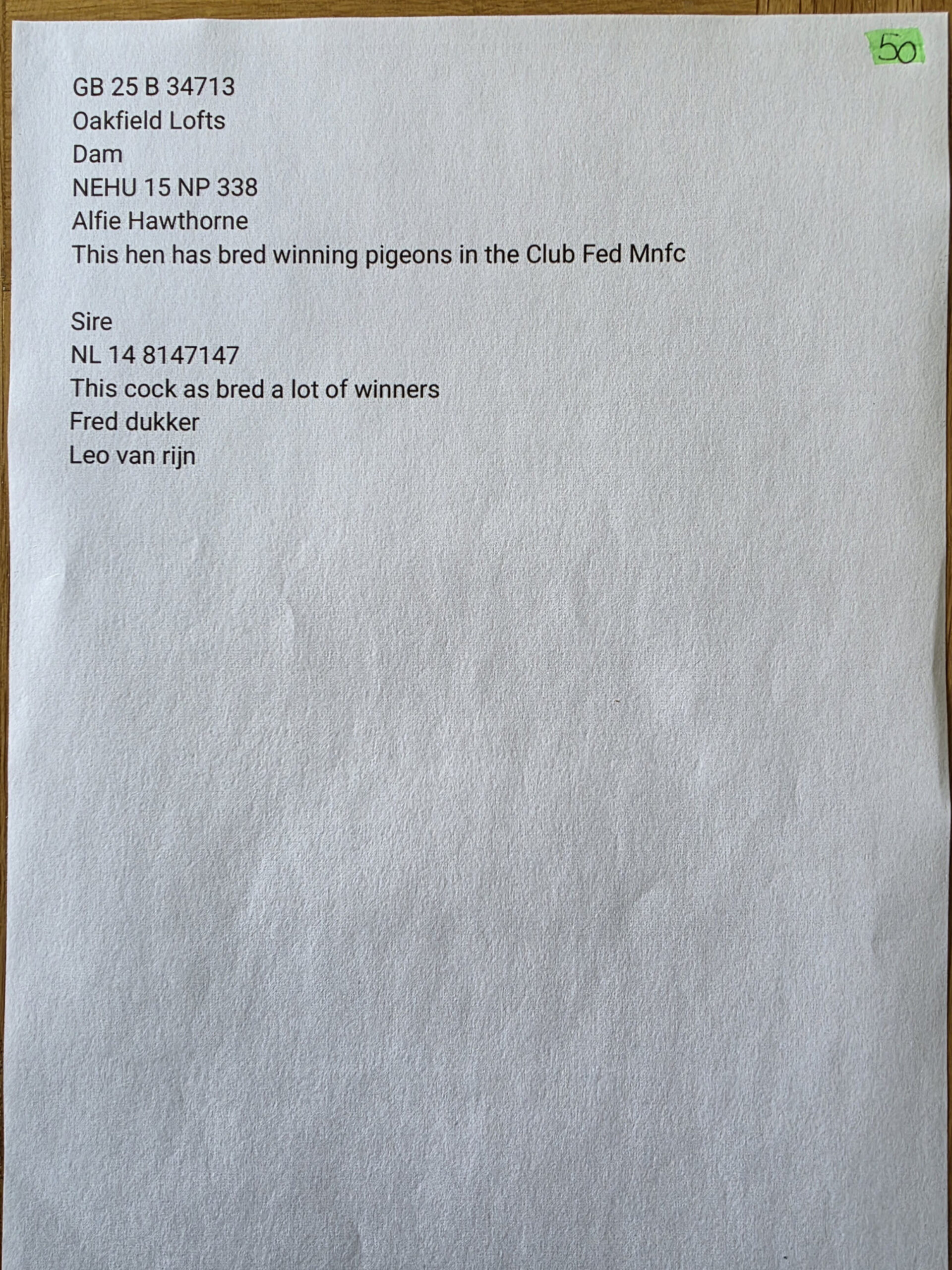 NL 14 8147147 he has bred a lot of winners and he is a Leo Van Rijn pigeon bred by Fred Dukker.