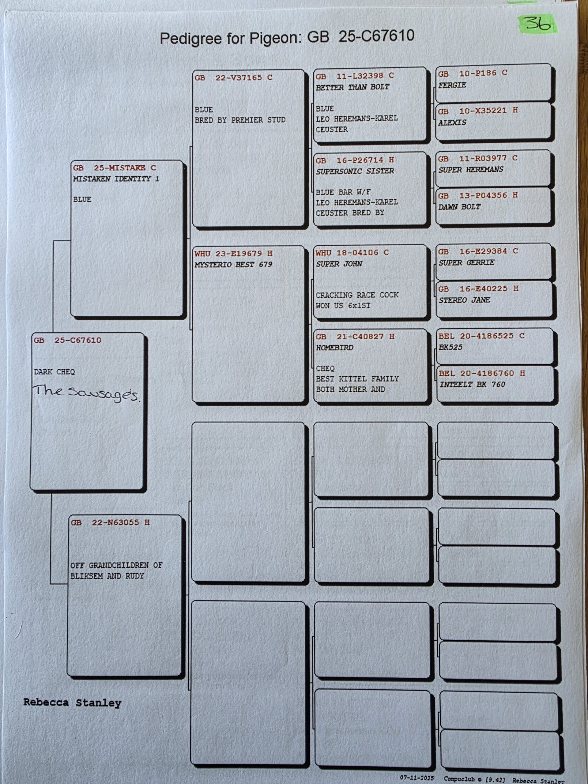 GB 25 Mistake “Mistaken Identity” bred from a son of Better Than Bolt X Supersonic Sister. The mother to Mistaken Identity is “Mysterio Best 679” from Sterio Brothers and is bred from a cock that won 6 X 1st X ‘Homebird’ a double granddaughter of Best Kittel.