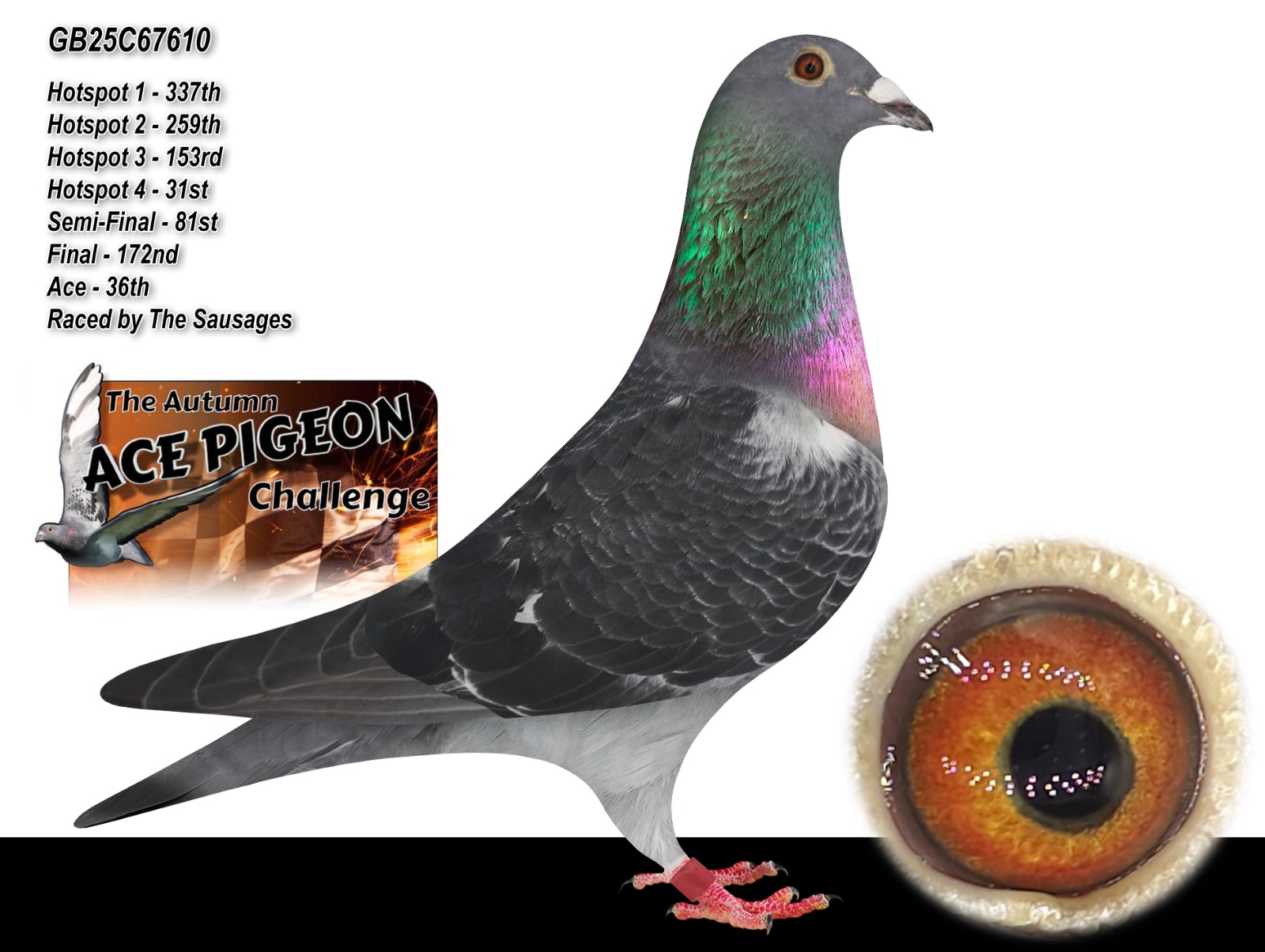 GB 25 C67610 Dark Cheq “Porky” winner of 36th ACE PIGEON AUTUMN CHALLENGE RACE for ‘The Sausages’
