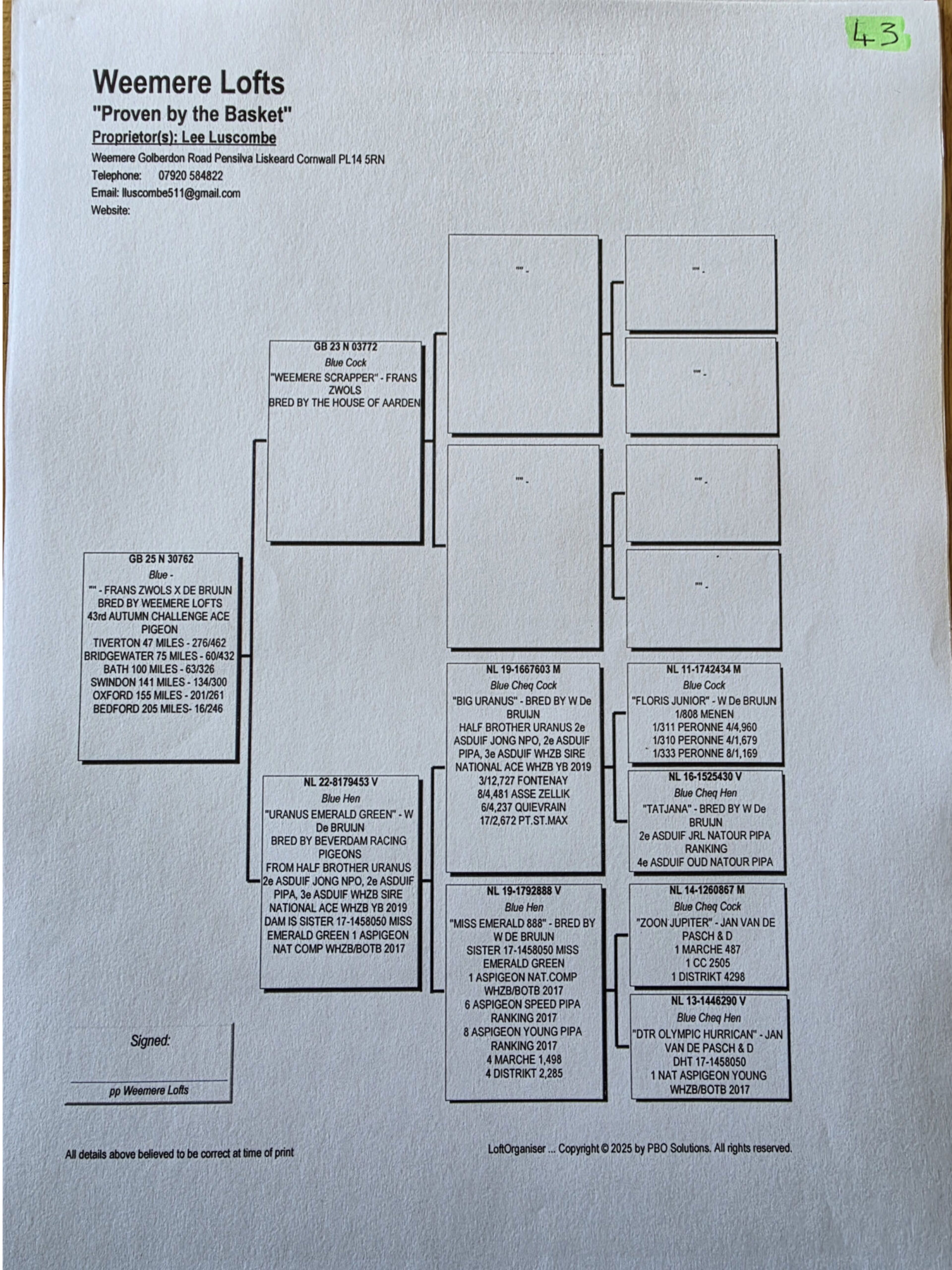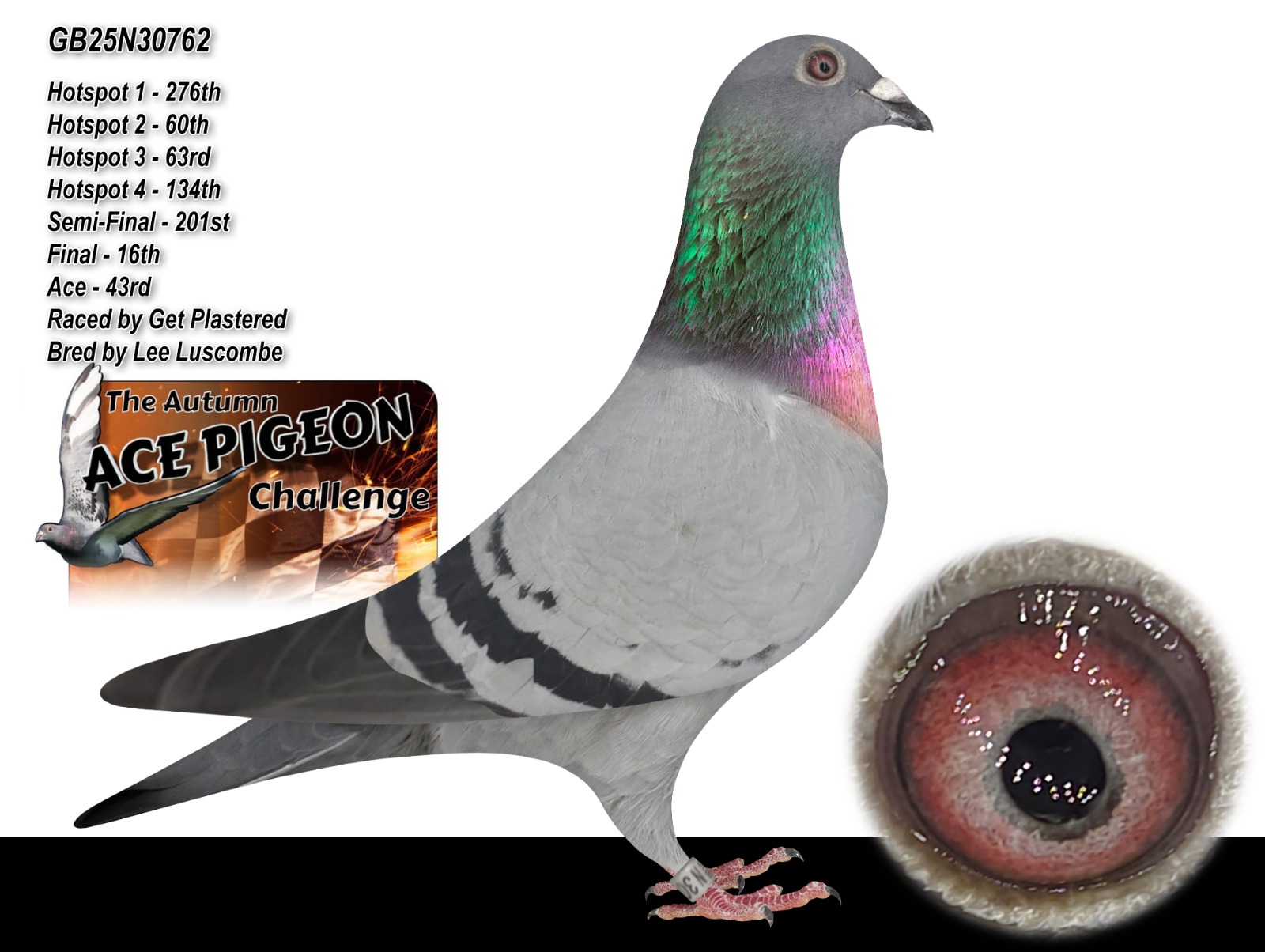 GB 25 N30762 Blue Zwols/De Bruijn “Skimcoat 62” winner of 43rd ACE PIGEON AUTUMN CHALLENGE RACE for ‘Get Plastered’