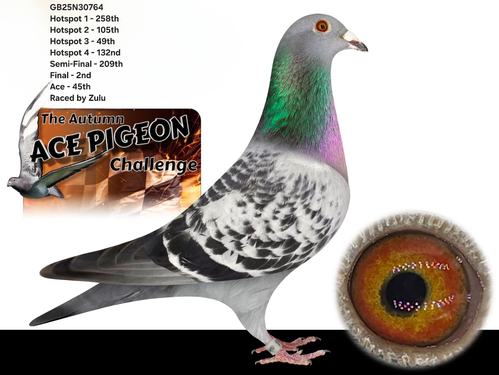 GB 25 N30764 Chequer Hen “Weemere 764” winner of 45th ACE PIGEON AUTUMN CHALLENGE RACE for “Zulu” she also won 258th HS1, 105th HS2, 49th HS3, 132nd HS4, 209th HS5 and 2nd in the Final race from Bedford. She is 100% G & S Verkerk.