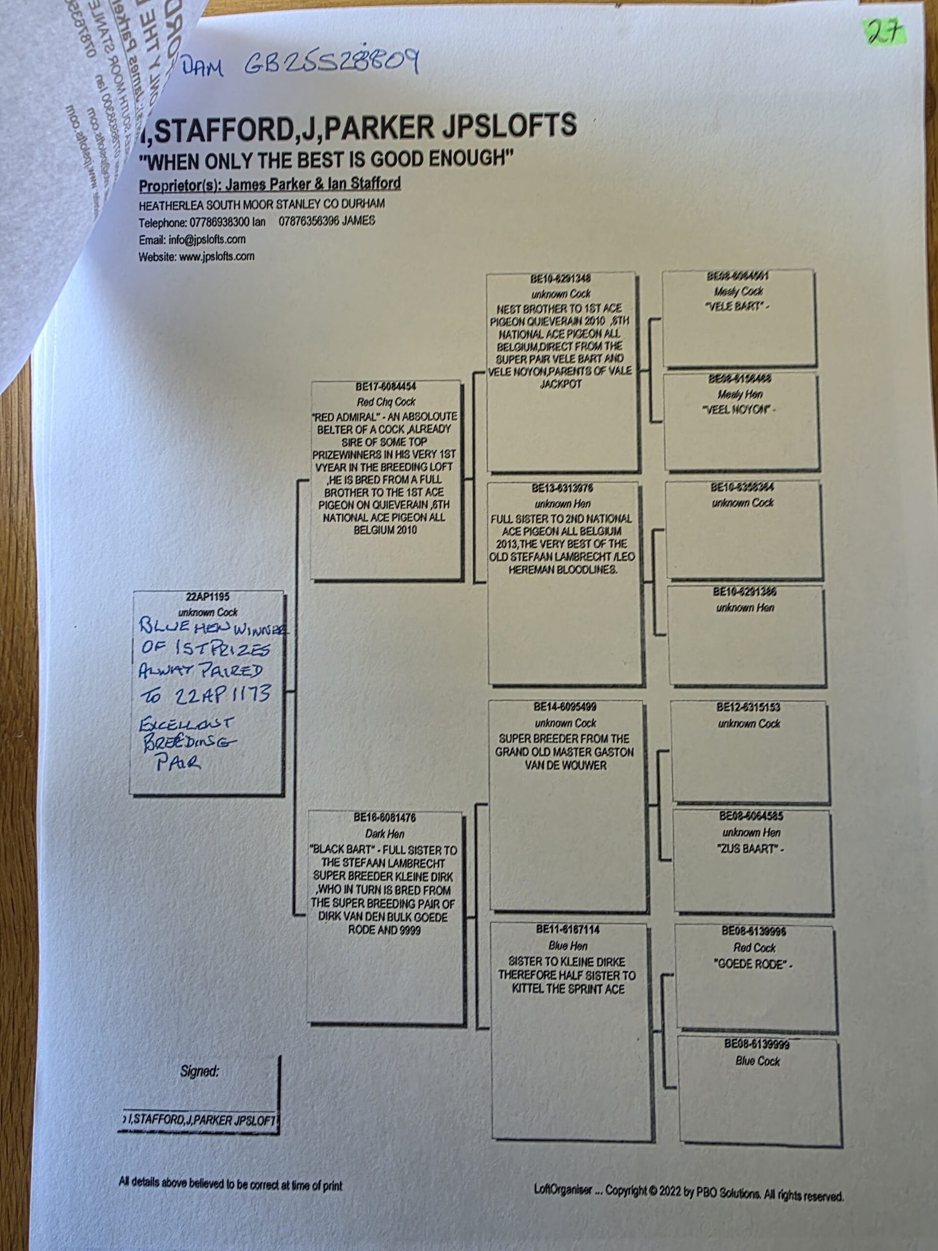 22 AP-1173 bred by JPS Lofts, he is a winner of many 1st prizes and he is sire & Grandsire of first prize winners; he is an excellent pigeon. He is a Stefaan Lambrechts pigeon bred from “Aslan & Conny”
