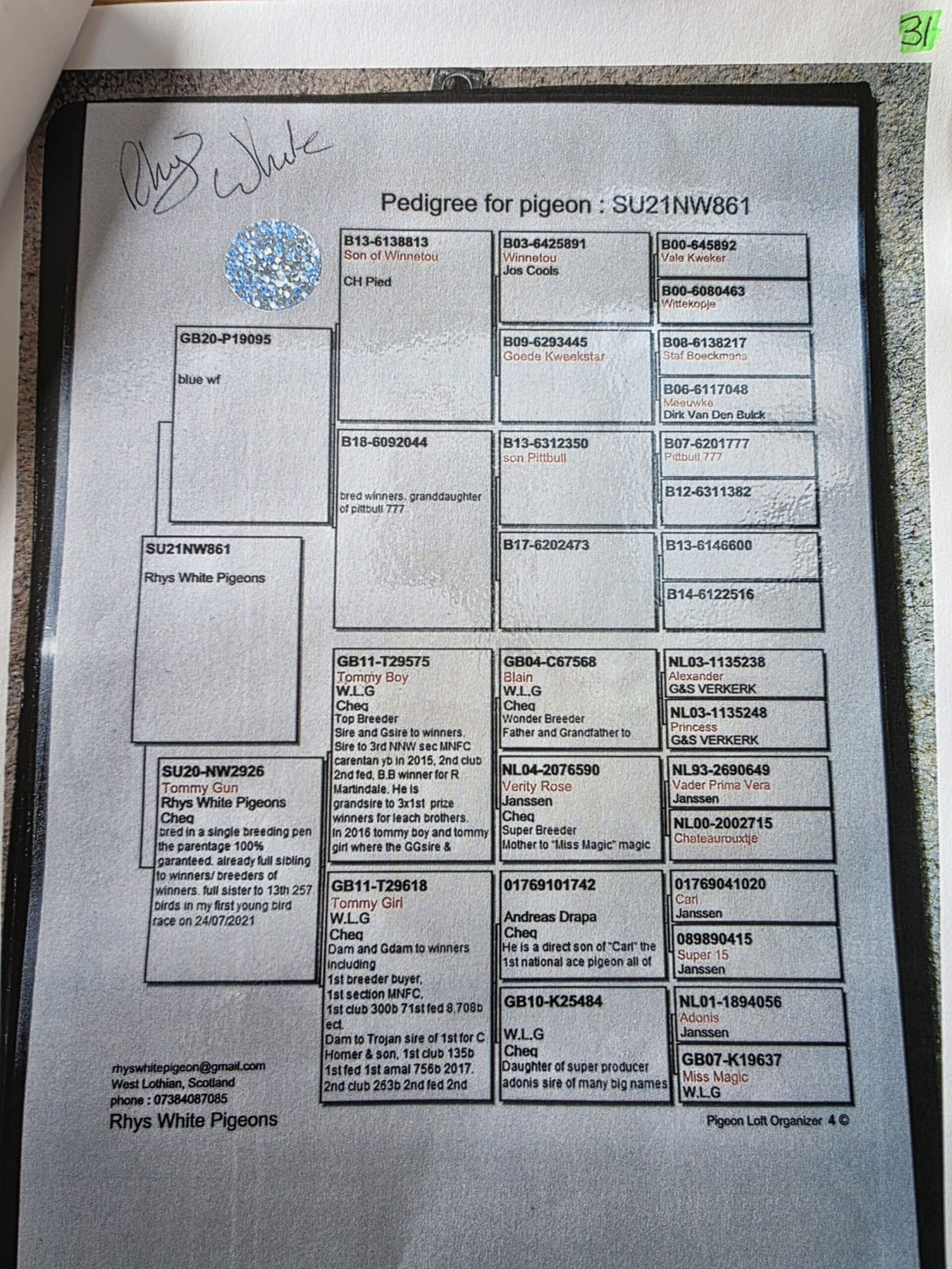 SU 21 NW 861 she was bred by Rhys White. Her father is 20 P19095 bred from a son of Winnetou X Goede Kweekster from Jos Cools and the mother to 19095 is a granddaughter of Pitbull 777.