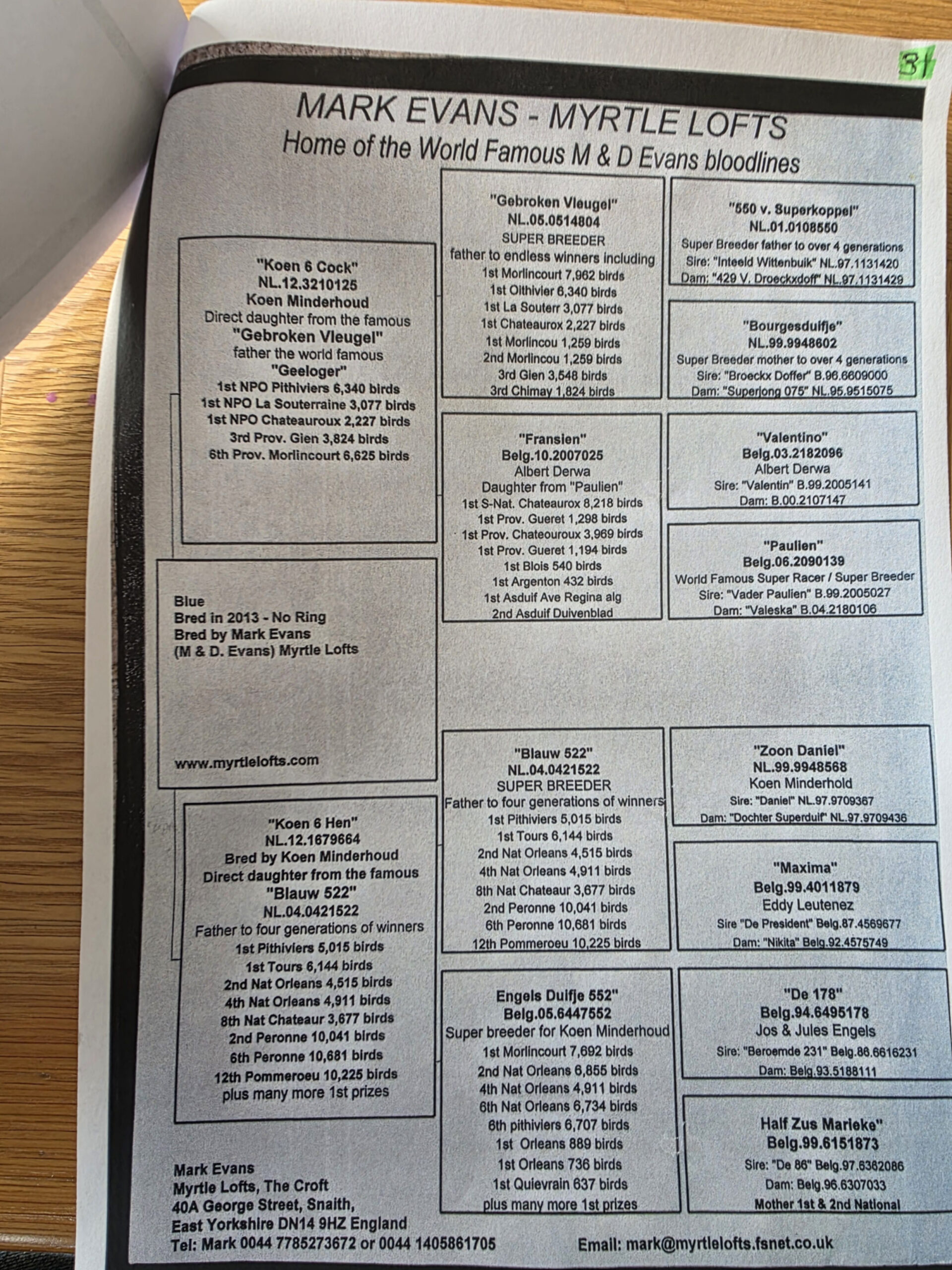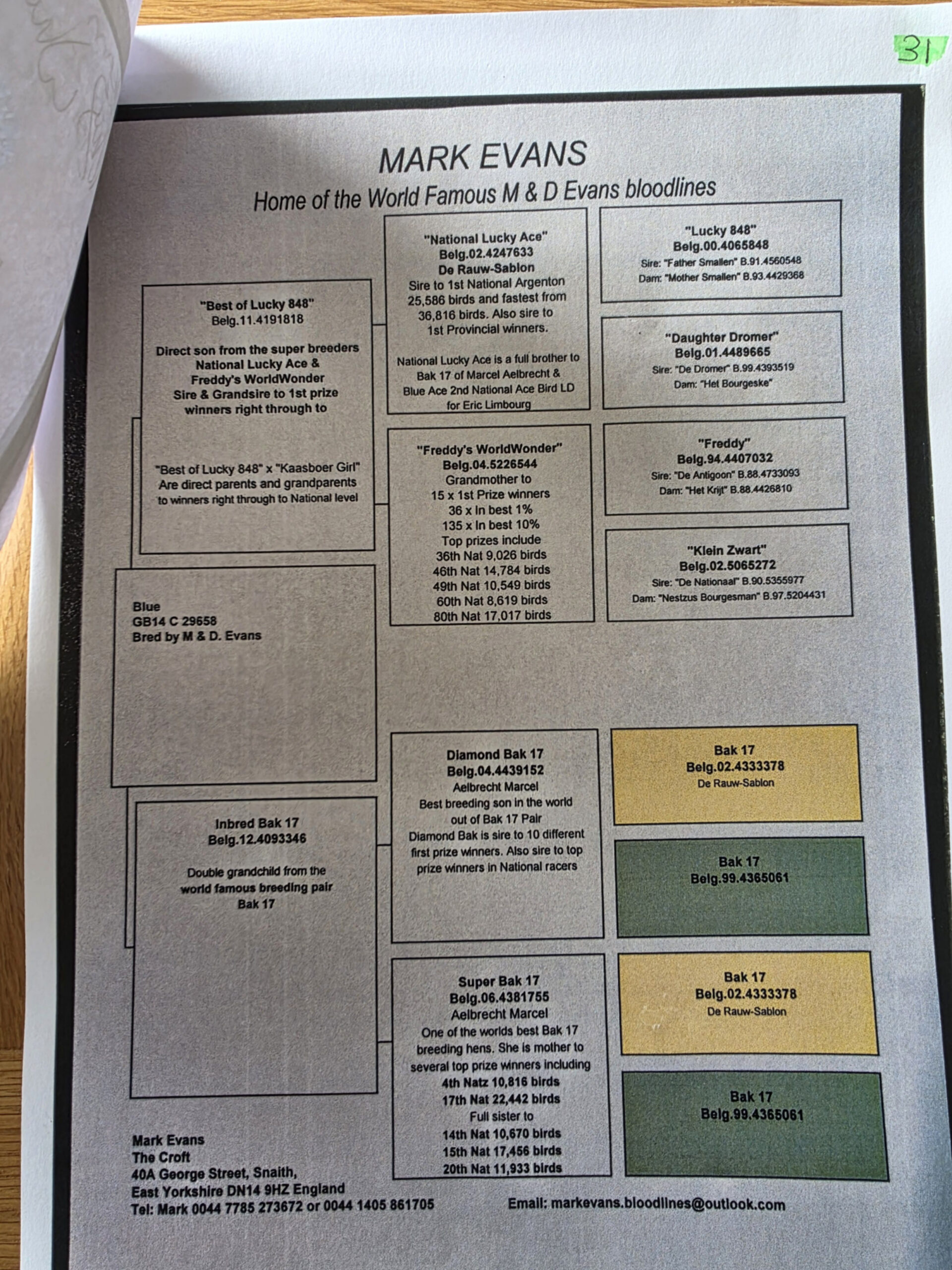 GB 22 V32619 bred by D & D Hunter and bred from two M & D Evans Vandenabeele pigeons. The 4 grandparents are Best Of Lucky 848, Inbred Bak 17Koen 6 Cock and Koen 6 Hen.