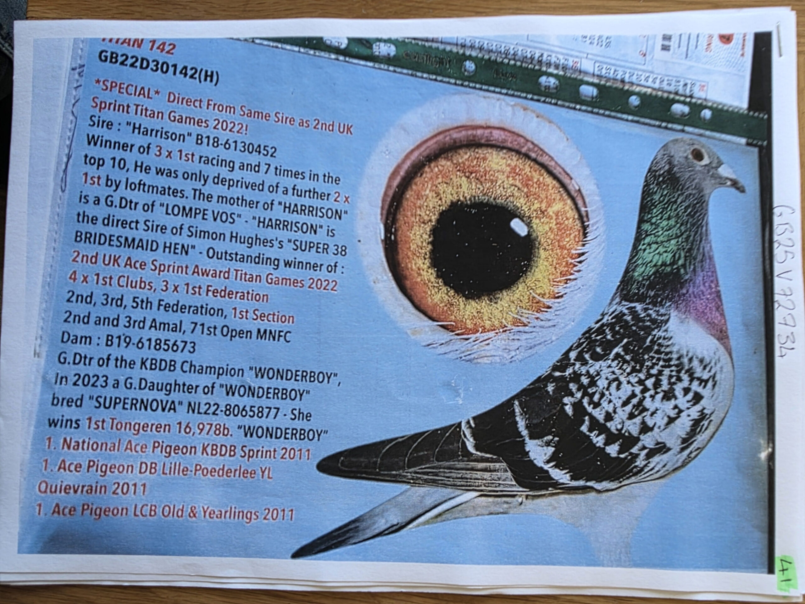 Harrison is from Simon Hughes’ ‘Super 38 Bridesmaid Hen’ winner of 2nd UK Ace Sprint Pigeon Titan Games 2022.
