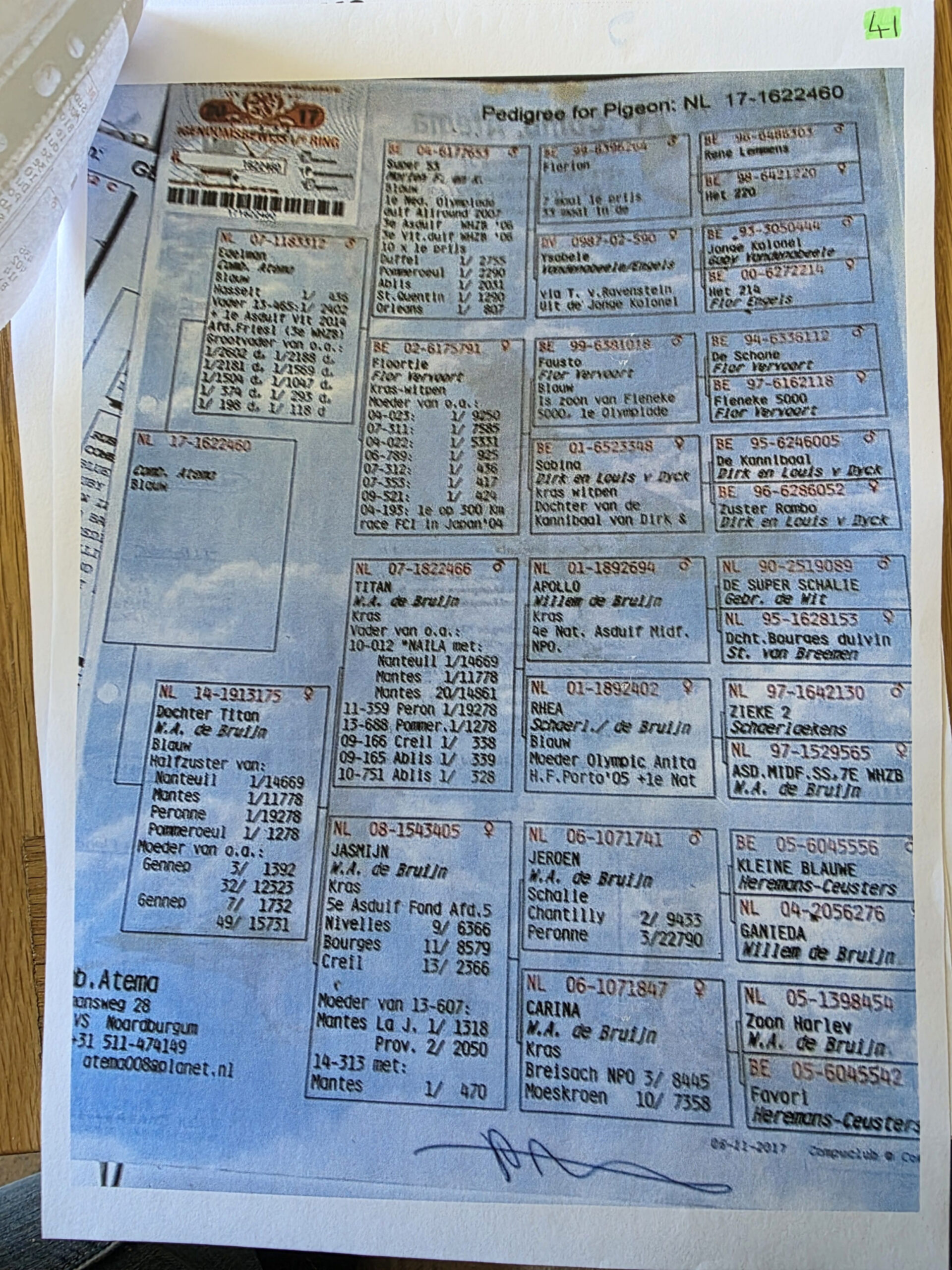 NL 17 1622460 bred by Atema, he is a grandson of Titan and Jasmin of Willem De Bruijn and his father is from Fler Vervoort pigeons.