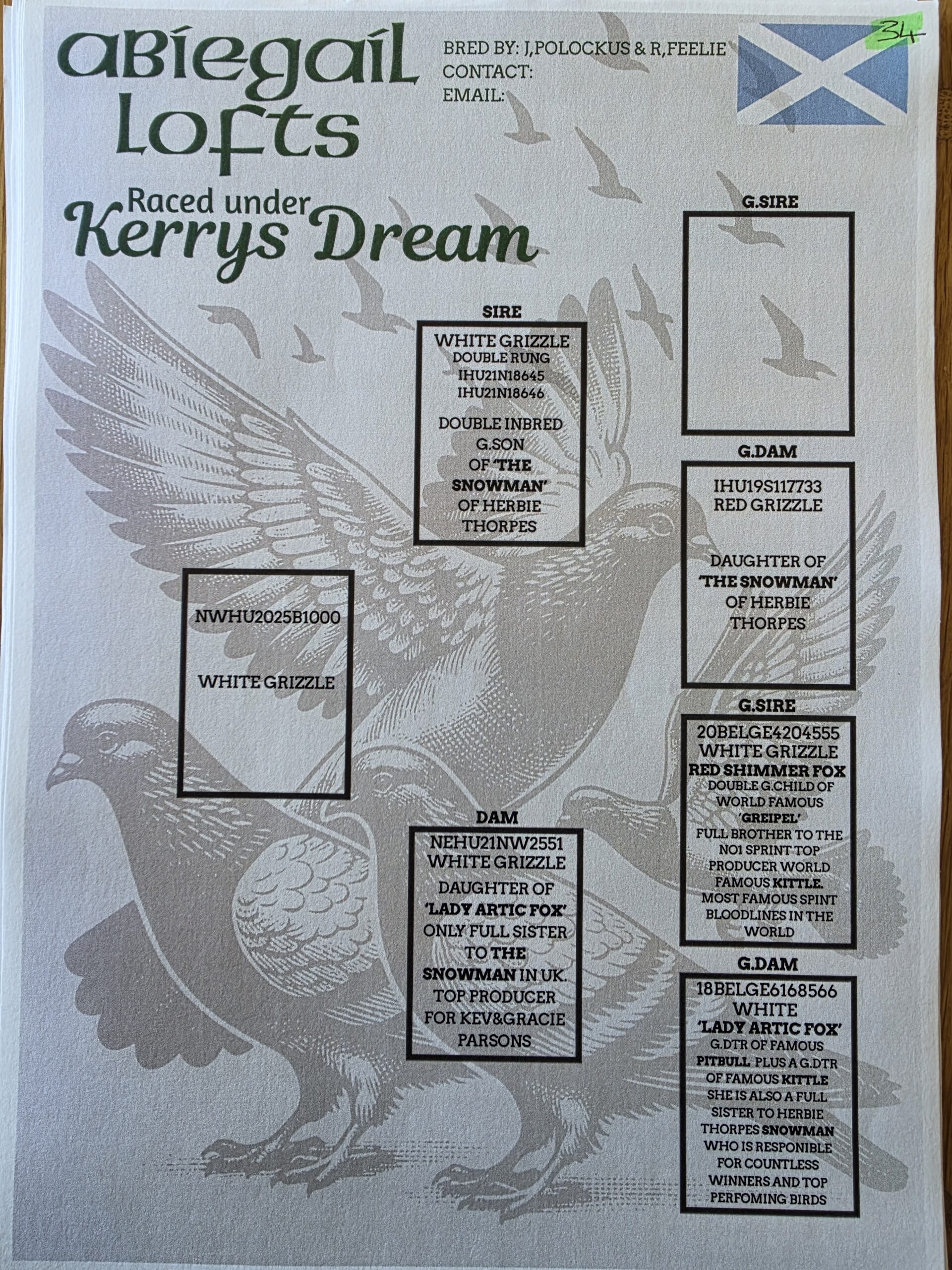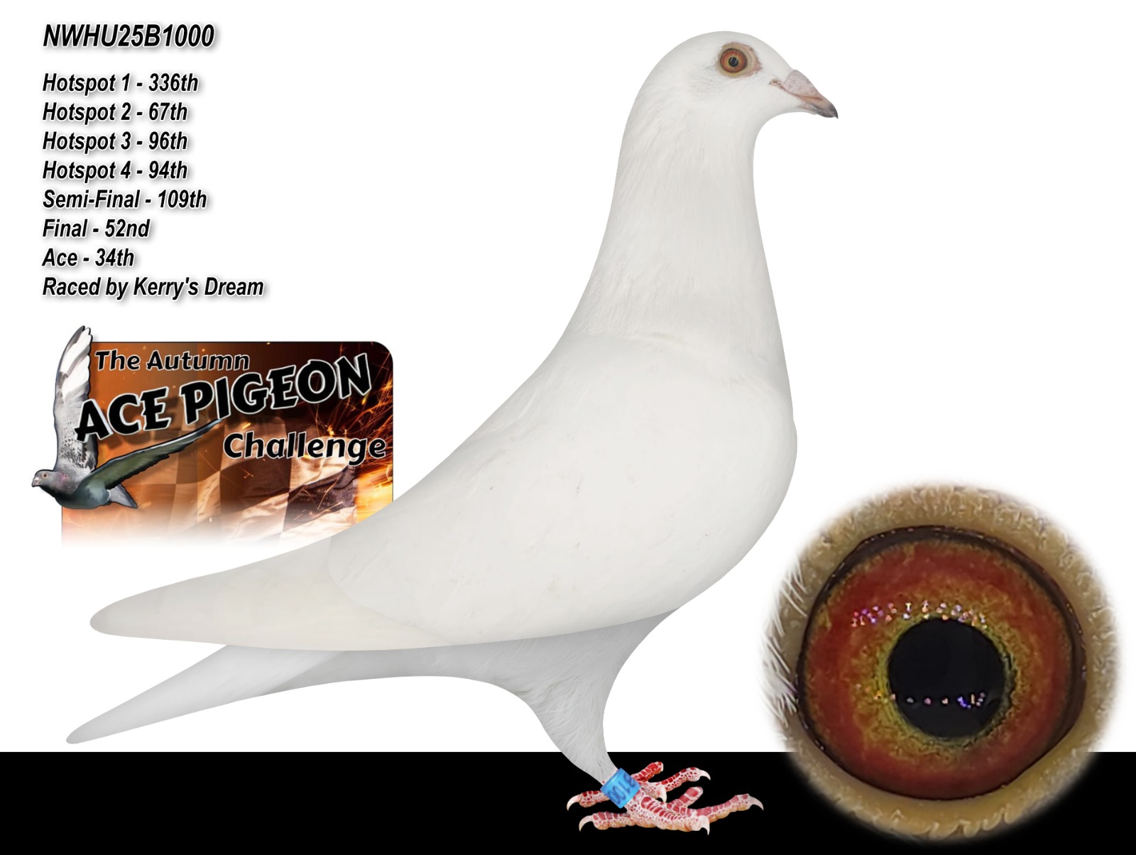 NWHU 25 B1000 White Grizzle “Kerry’s 1-K Dream” winner of 34th ACE PIGEON AUTUMN CHALLENGE RACE for ‘Kerry’s Dream’