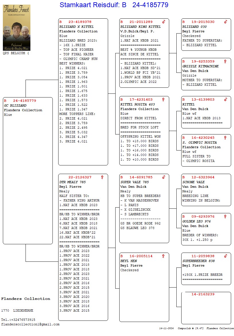 23-4189378 “Blizzard & Kittel” he is a direct son of Blizzard King Kittel and his mother is a direct daughter of Kittel X Kittel-Rosita 403, which is a sister to Olympic Rosita, so Kittel paired to his aunt. Descendants of Kittel have won worldwide and have won 1st to 18,000b+, 1st 17,000b, 1st 16,000b, 1st 14,000b and 1st 10,000b, also many 1st National Ace Sprint pigeons KBDB, RPRA, Hungary, Poland, Germany, Holland etc and many of the main international OLR like Golden Algarve, European Masters, Victoria Falls, etc have all been won with Kittel bloodlines.