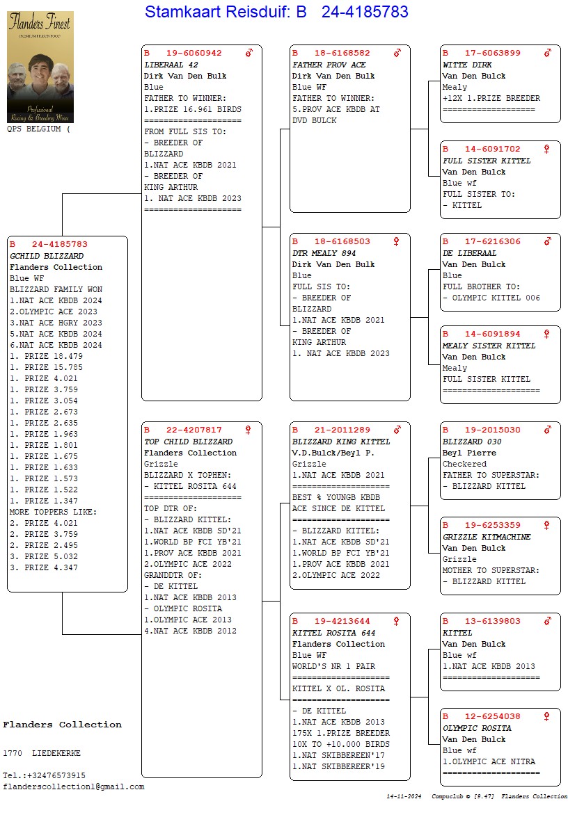 Blizzard King Kittel is the super 1st National Ace Speed KBDB 2021, Best YB KBDB ace since Kittel, he won 1st National Ace, 1st World Best Pigeon FCI Young Bird 2021 and 1st Provincial Ace KBDB, 2nd Olympic Ace 2022. He has now bred a legacy of winners worldwide, everything he breeds seems to turn to gold and these are the most sought-after sprint pigeons in the world today!