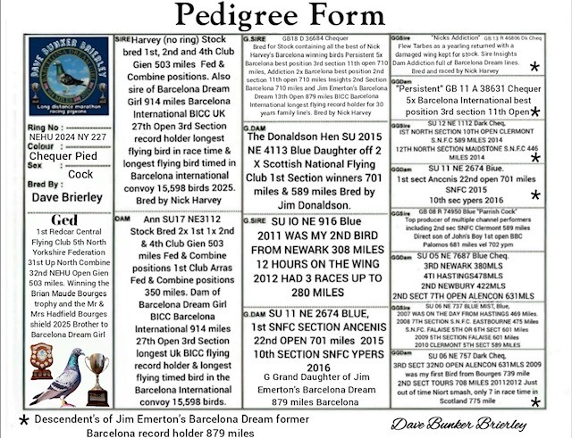 Dave Brierley has donated a youngster direct from his exceptional Barcelona hen, Barcelona Dream Girl—the 914‑mile warrior who finished 27th Open, 3rd Section in last year’s BICC Barcelona International, and the longest‑flying UK bird in race time and distance. With a youngster already sitting in the nest, this is a rare and valuable chance to secure a direct child from a true Barcelona warrior.