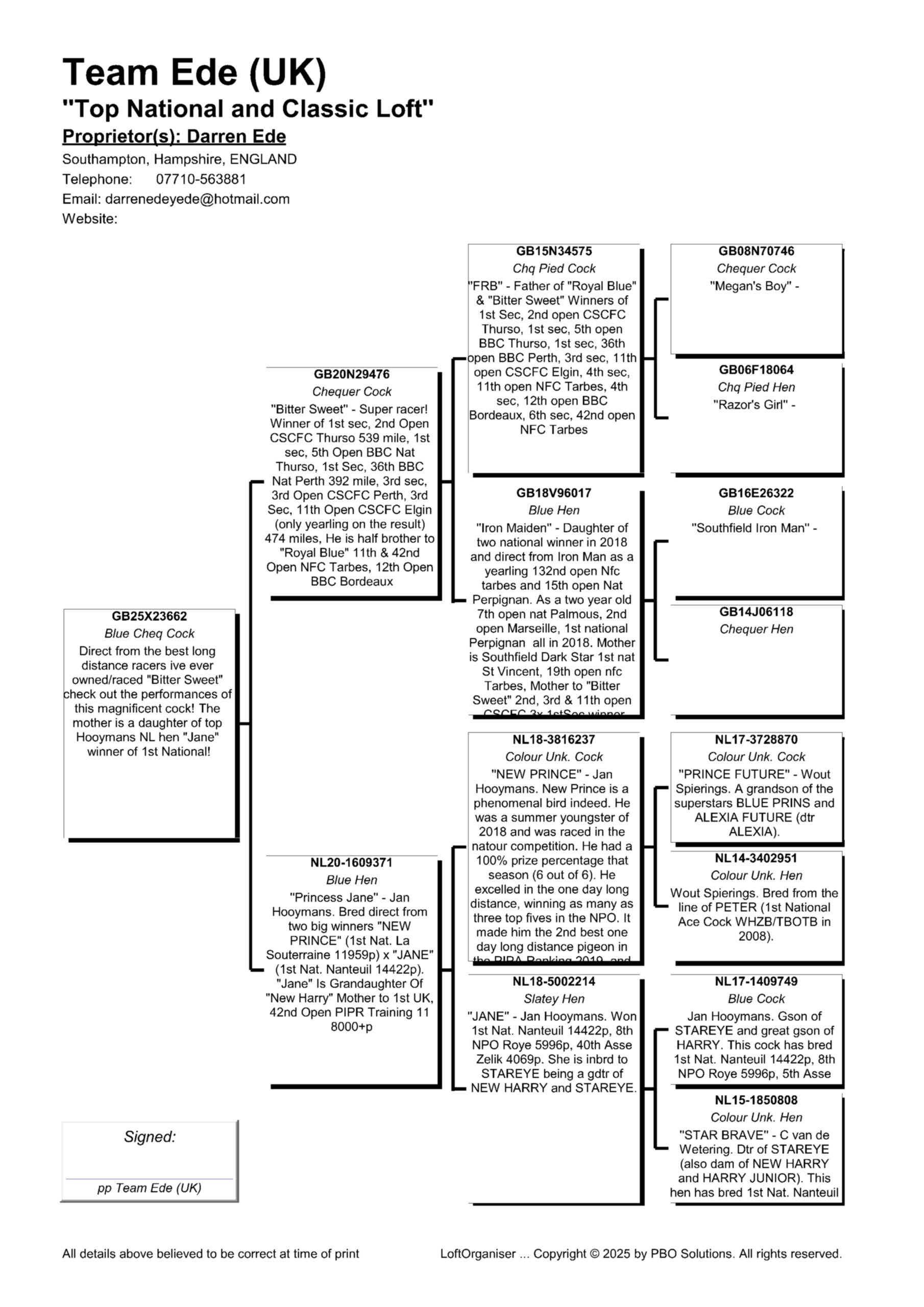GB 25 X23662 Chequer Cock “Kroon Prince” He is bred from the best long distance racer Darren has ever raced and owned.
