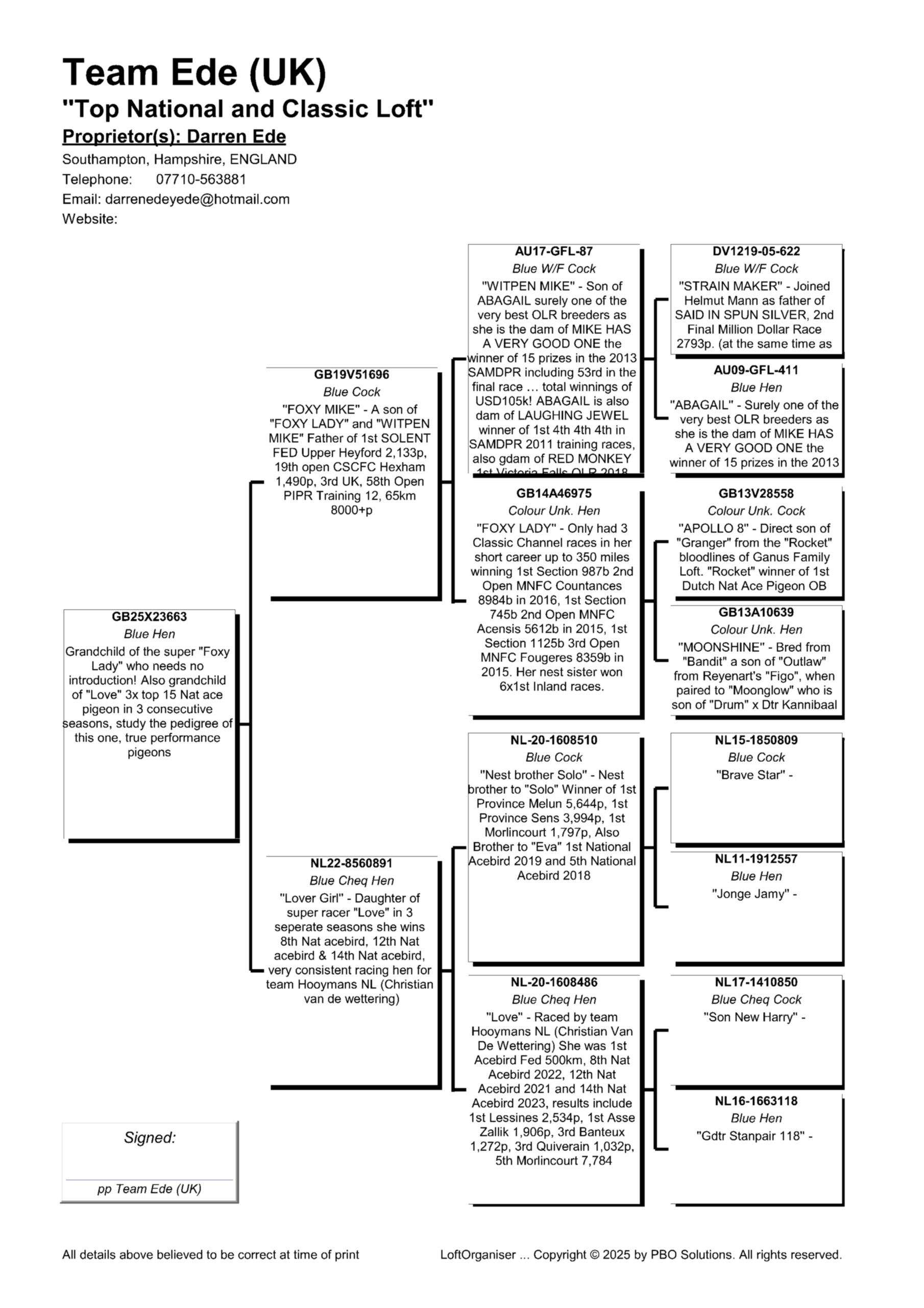 The mother to Lover Girl is ‘Love’ and in three separate seasons she won 8th National Ace Pigeon, 11th National Ace and 14th National Ace. She raced for Team Hooymans NL under the management of Christian Van Wettering. Her 4 grandparents are Brave Star, Jonge Jamy, Son New Harry and grdtr Stampair 118