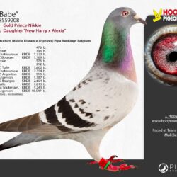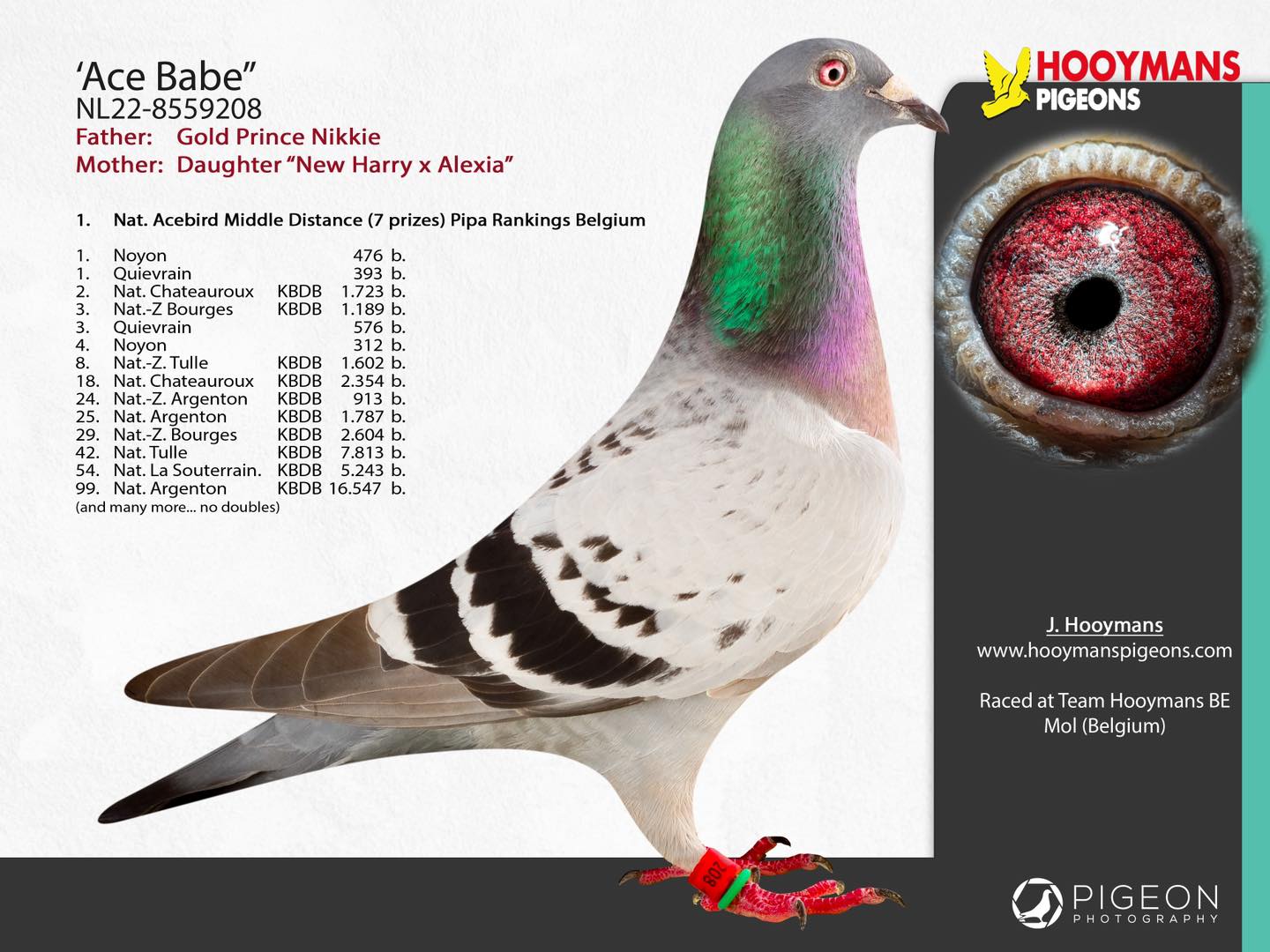 NL 22-8559950 “The 950” he was raced by John Crehan of Salford and won 1st Yeovil against 985b, 5th NW Grand National Weymouth 769b, 6th Worcester 1,115b, and he has sired 1st & 3rd Combine Hullavington 1,018b, 2nd Amal Cheltenham 1,508b, 5th Amal 1,279b and he is a full brother to the 1st National Ace Pigeon “Ace Babe”