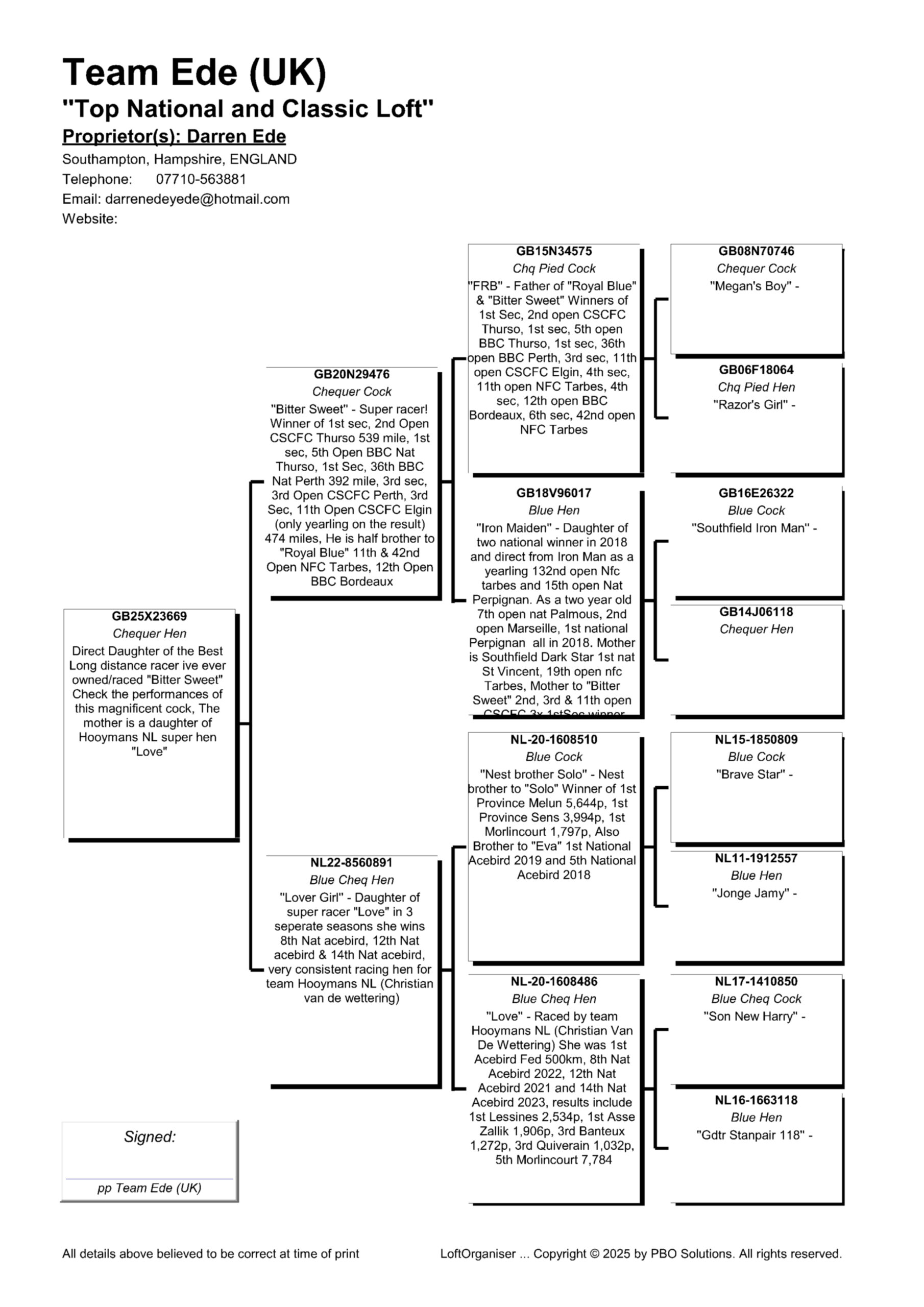 GB 25 X23669 Chequer Hen “Sweet Thing” she is bred from the best long distance racer Darren has ever raced and owned.