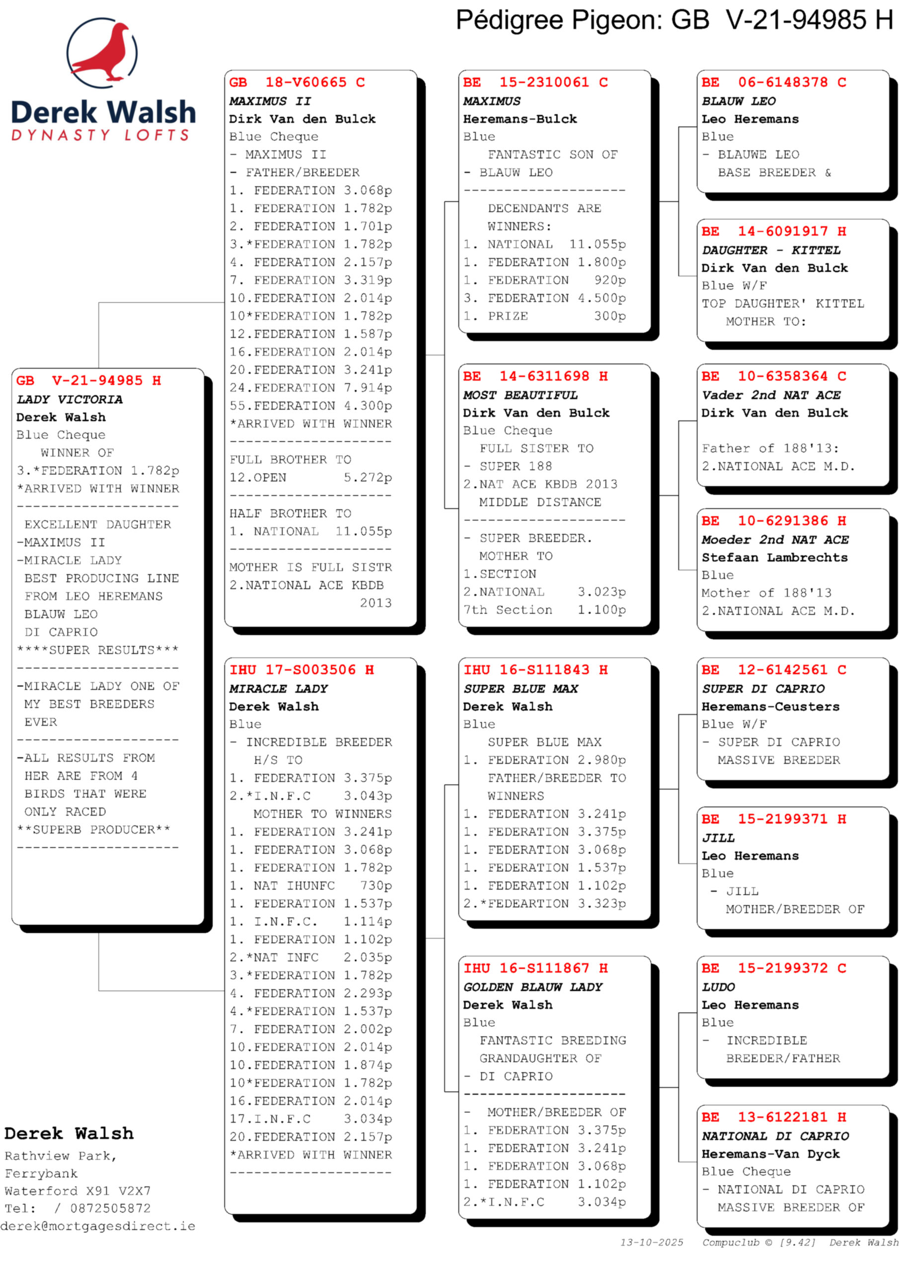 GB 21 V94985 Chequer Hen “Lady Victoria” she is a winner of 3rd Fed 1,782b when she arrived with the winner. She is from all the golden lines of Bulck, Stefaan Lambrechts and Leo Heremans.