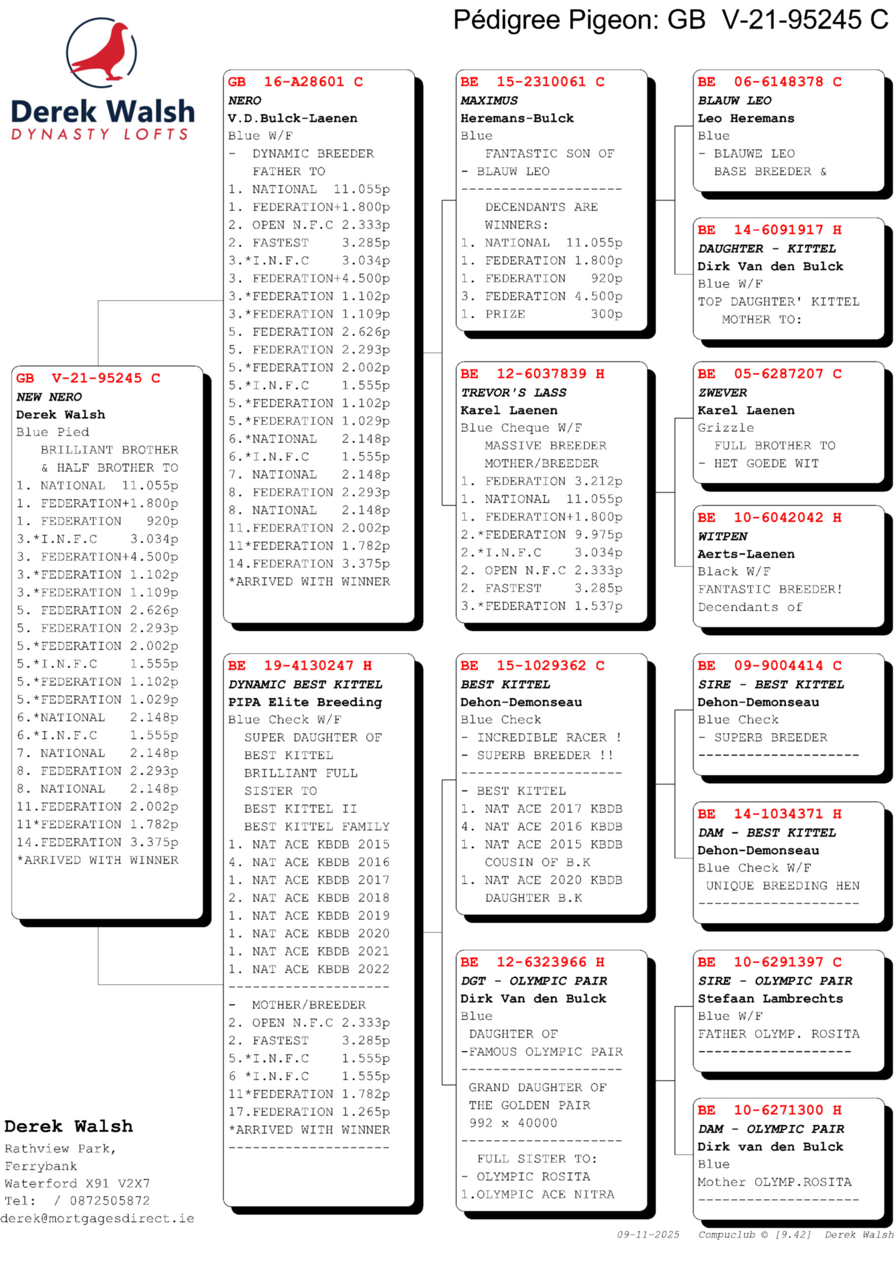 GB 21 V95245 Blue Pied Cock “New Nero” he is a brilliant brother & half-brother to 1st National 11,055b, 1st Fed 1,800b, 1st Federation 920b, 3rd INFC 3.034b, 3rd Federation +4.500b, 3rd Federation 1.102b, 3rd Federation 1.109b, 5th Federation 2.626b, 5th Federation 2.293b, 5th Federation 2.002b, 5th INFC 1.555b, 7th National 2.148b, 11th Federation 2.002b, 11th Federation 1.782b and 14th Federation 3.375b.