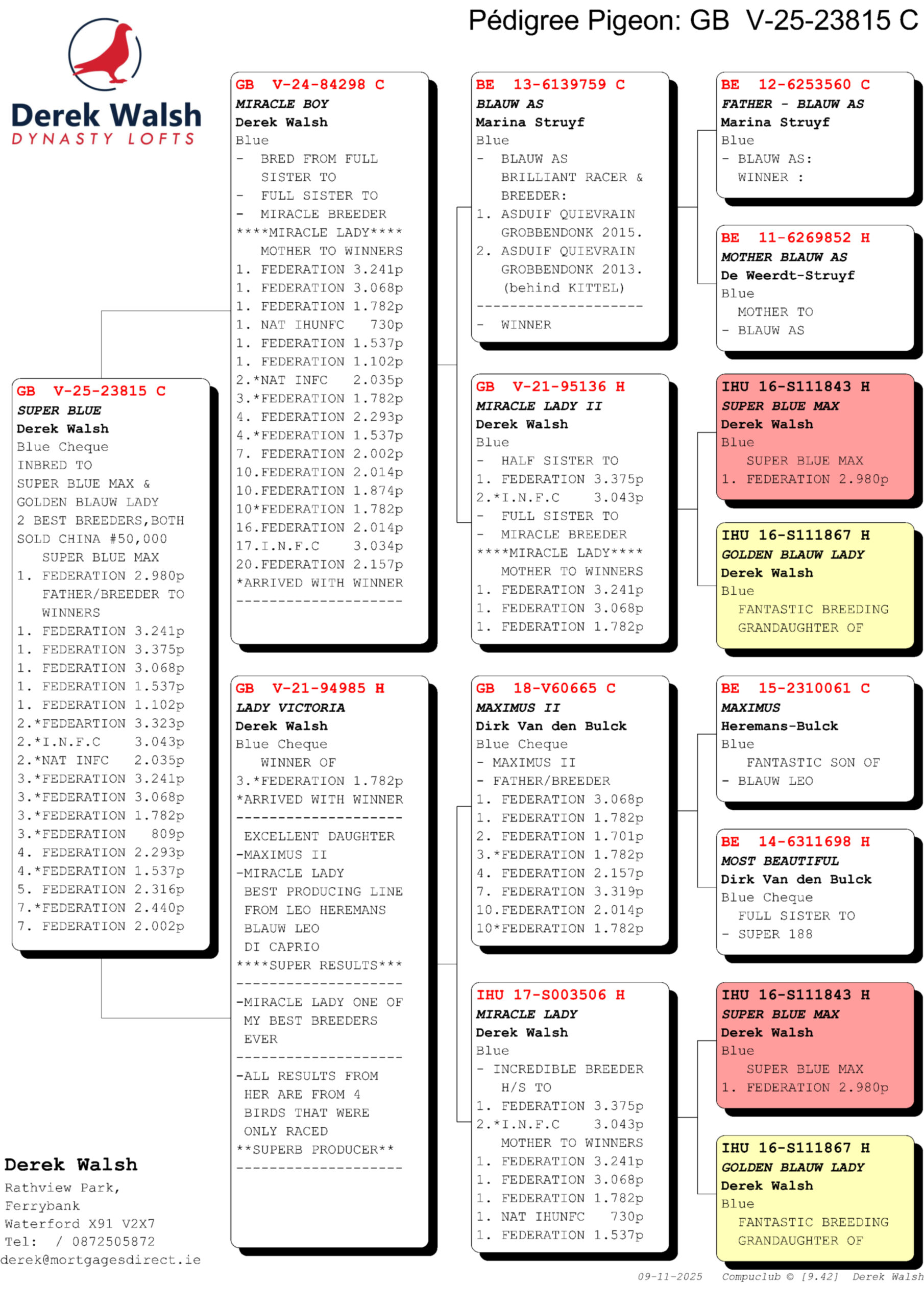 The mother to Miracle Boy is GB 21 V95136 Blue Hen “Miracle Lady II” and she is a half-sister to 1st Fed 3,375b, 2nd I.N.F.C 3,043b behind a loft mate and she is a full sister to the miraculous Breeder ‘Miracle Lady’