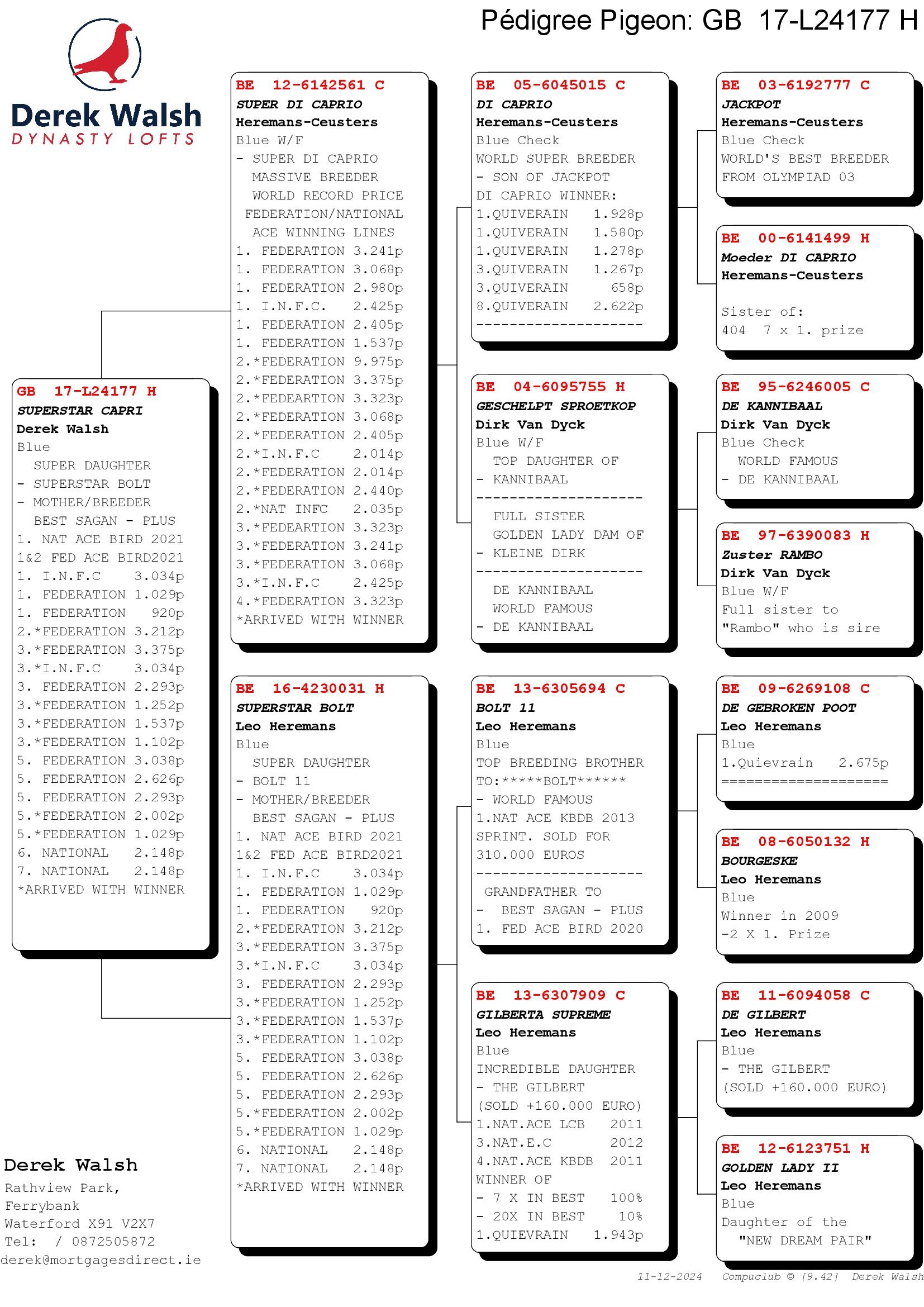 GB 17 L24177 Blue Hen “Superstar Capri” she has bred winners with different cocks including ‘Best Sagan’ many of her children are in the auction and she is a top breeder; she is a granddaughter of Di Caprio and of Bolt II & Gilberta Supreme.