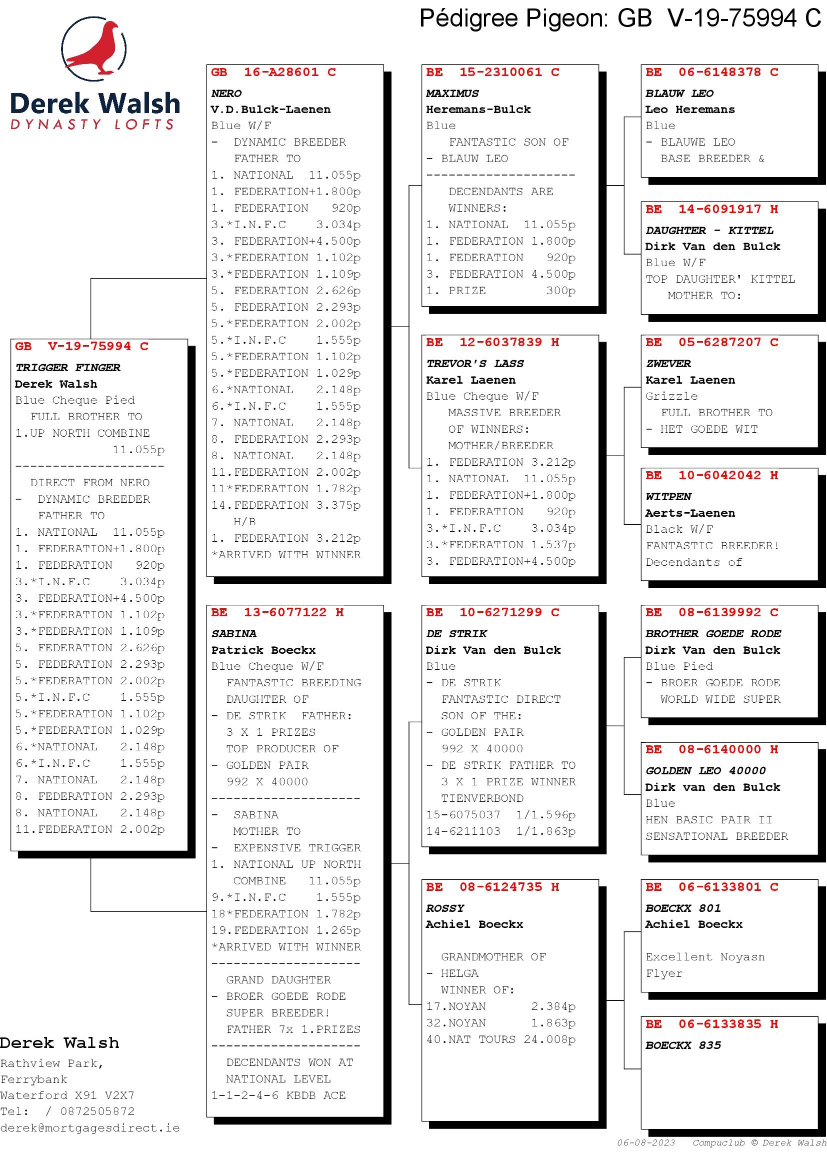 GB 19 V75994 Cheq Pied Cock “Trigger Finger” he is a full brother to the winner of 1st UNC against 11,055b he is direct son from Nero X Sabina.