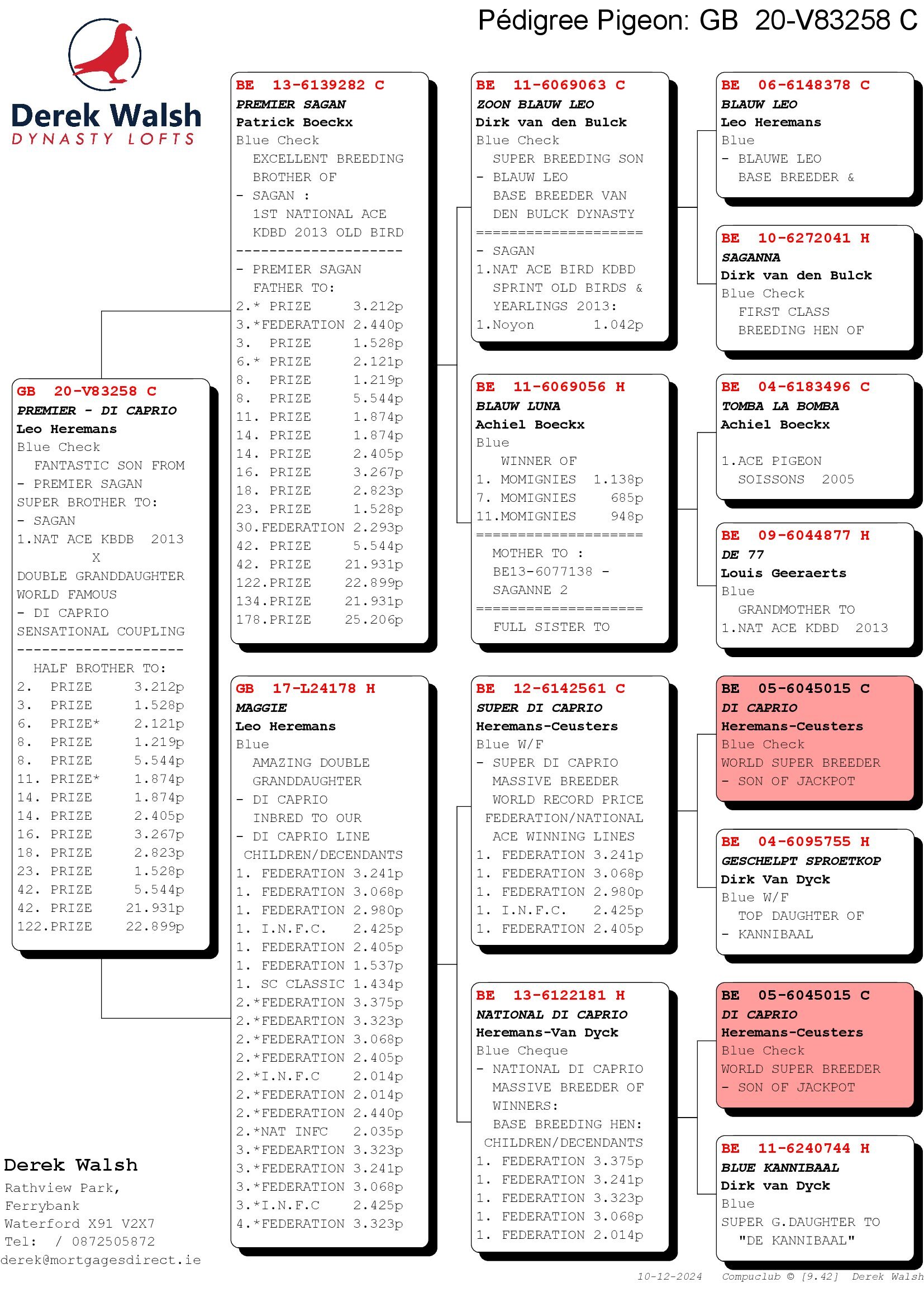 GB 20 V83258 Cheq Cock “Premier Di Caprio” fantastic son of the top brother of Sagan. He is a half brother to many winners as can be seen on his fully documented pedigree.