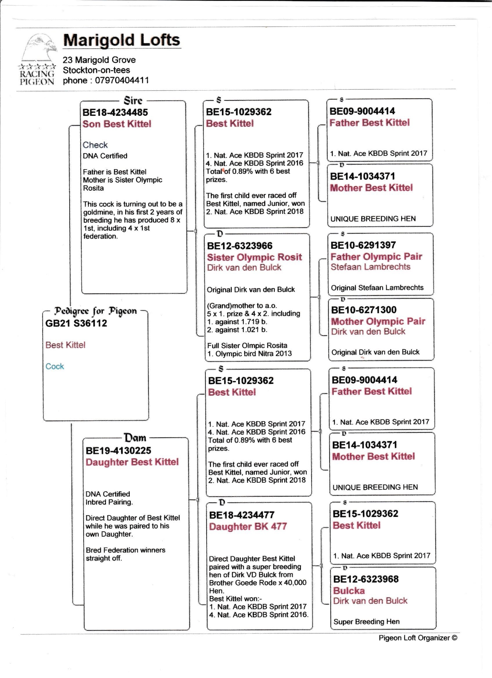 DAM Belge 19-4130225 she is a direct daughter of Best Kittel X Belge 18-4234477 and she is a daughter of Best Kittel X Bulcka, the daughter from Dirk Van Den Bulcks Base Couple Brother Goed Rode X 40000 Duivin, Bulcka has bred over 7 X 1st prize winners and she is the grandmother to federation winners all over Europe.