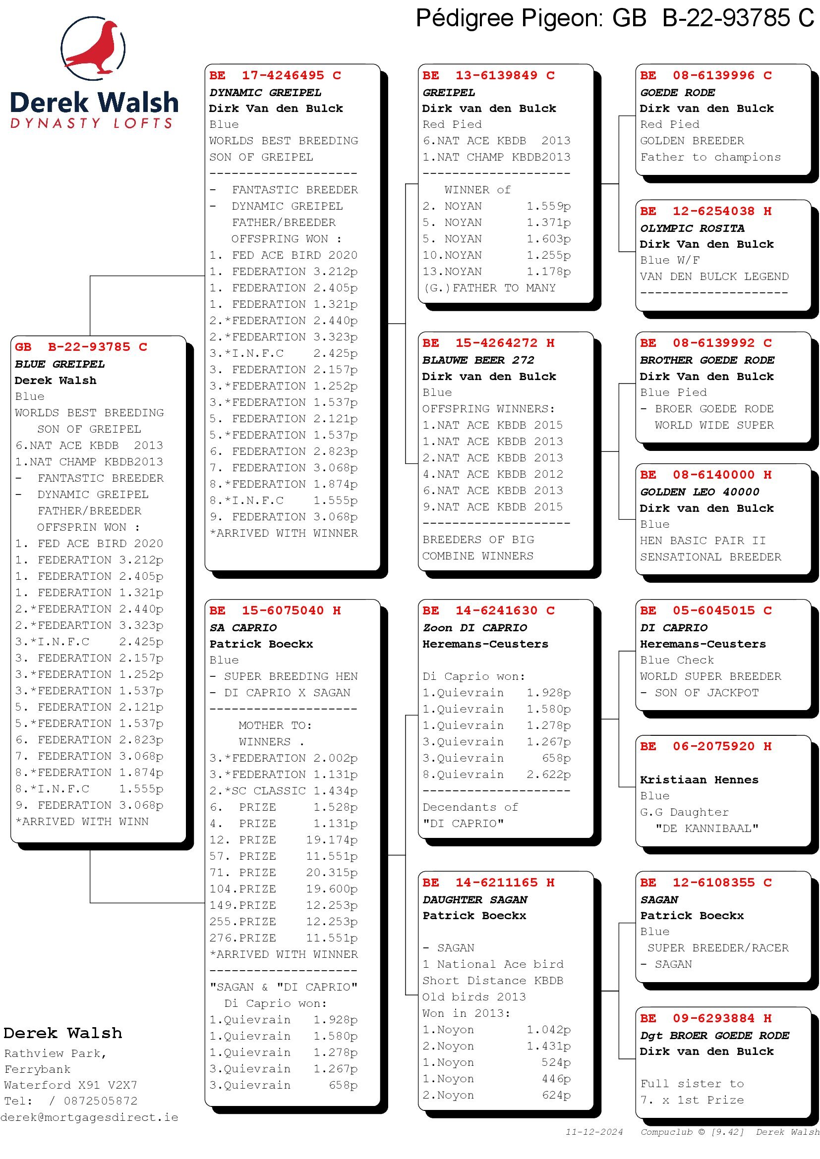 GB 22 B93785 Blue Cock “Blue Greipel” he is a grandson of Greipel, Blauwe Beer 272 and his mother is a granddaughter of Sagan and Di Caprio.