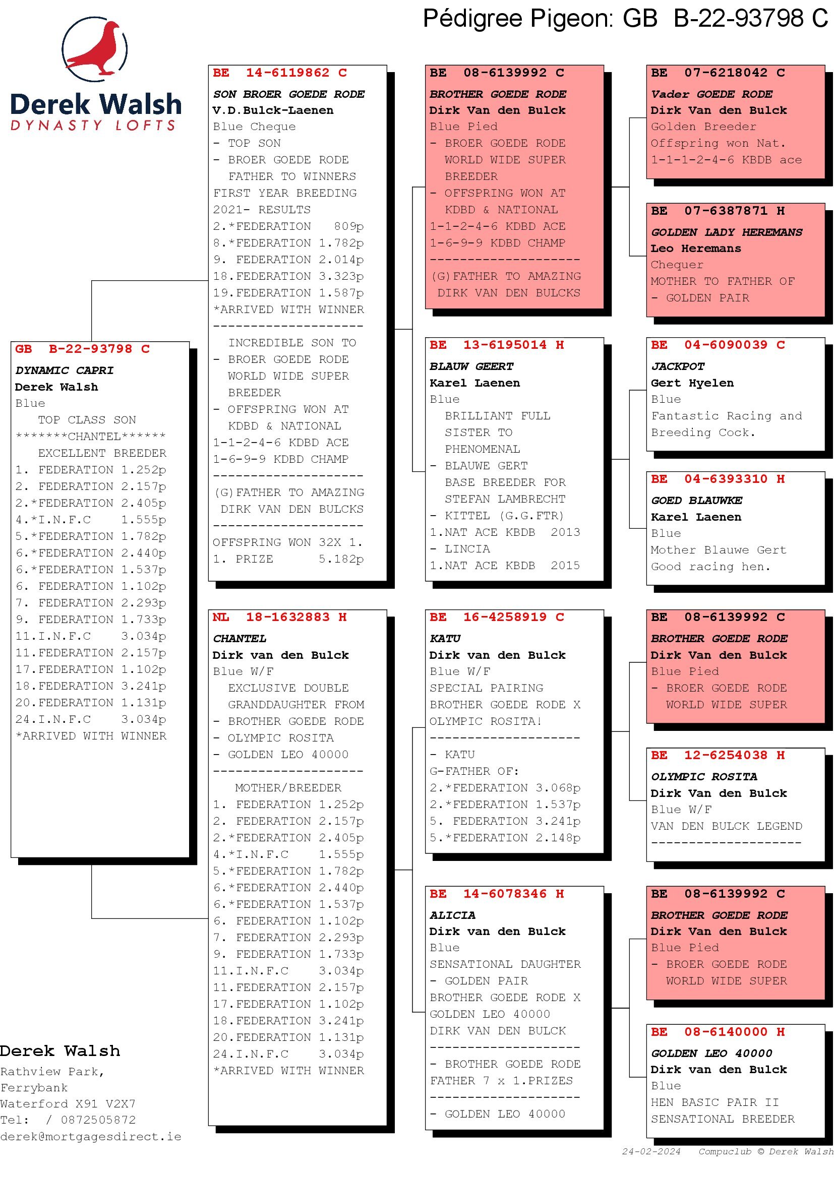 GB 22 B93798 Blue Cock “Dynamic Capri” a top-class son of Chantel and inbred to the No1 Bulck reproducer ‘Brother Goede Rode’ ” I really cannot offer them much better bred than this cock, it has cost me a fortune over the years to build my breeding loft to what it has become and many of the pigeons on offer cannot be bred again as a lot of the parents have gone onto different countries and on many lots, the pigeons I bought from have also been sold to China and other places. This hen represents such bloodlines; her parents and grandparents are now in other countries or are no longer fertile.