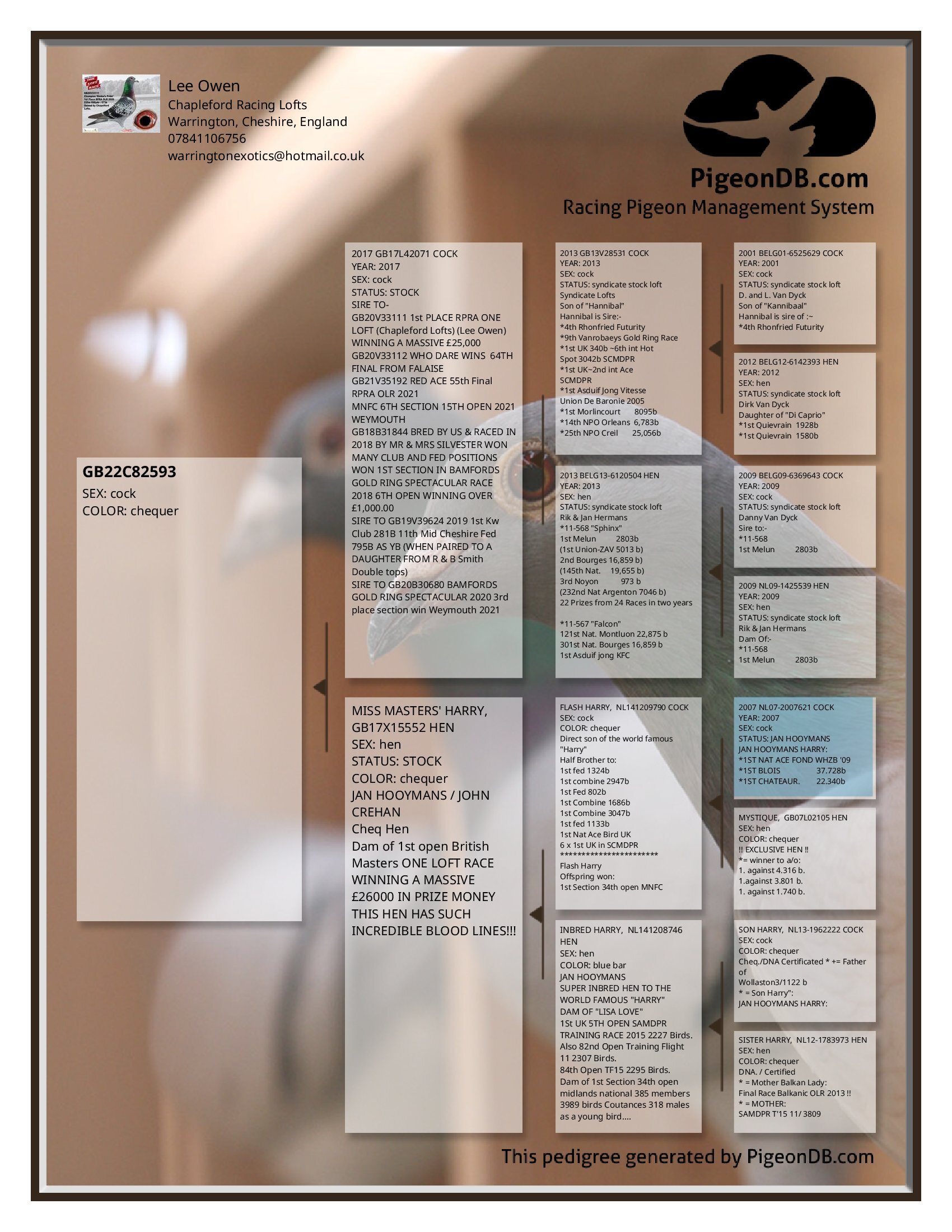 DAM GB 17 X15552 “Miss Masters Harry” she is a Jan Hooymans hen bred by John Crehan; she is the mother to the 1st Open British Masters One Loft Race winner winning £26,000; she is direct from Flash Harry, the wonder son of Harry X Mystique and the mother to Miss Masters Harry is ‘Inbred Harry’ the mother to ‘Lisa Love’ winner of 1st UK 5th Training Race against 2,227b in the SAMDPR; she is bred from a son of Harry X a sister to Harry.