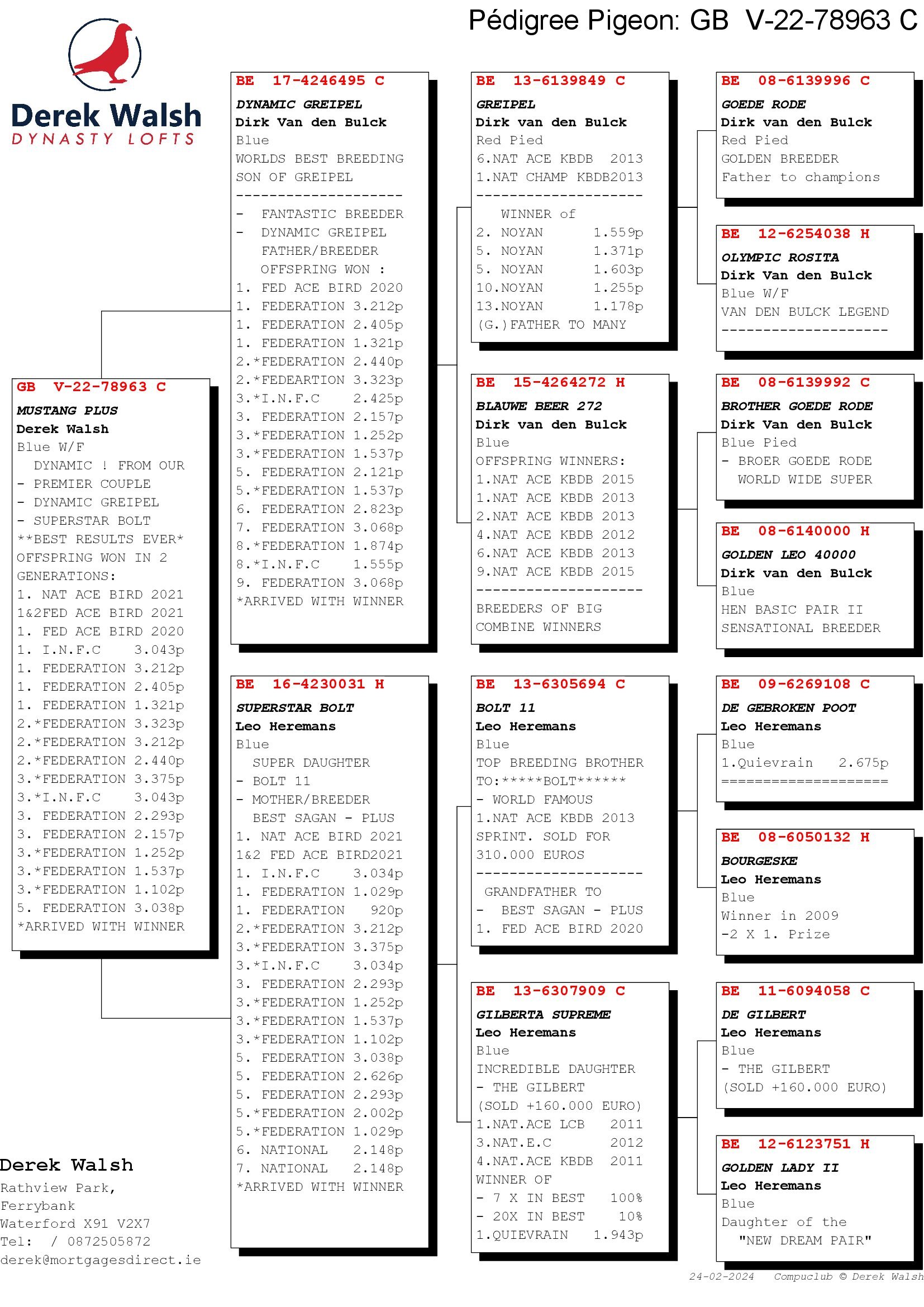 Belge 16-4230031 “Superstar Bolt” she is bred from ‘Bolt II and Gilberta Supreme’ and she is an incredible stock hen having bred 1st National INFC 3,034b, 1st & 2nd Fed Ace Birds 2021, 1st Nat Ace Bird 2021, 1st Fed 1,029b, 1st Fed 920b, 2nd Fed (to loft mate) 3,212b, 3rd Fed 3,375b, 3rd INFC 3,034b, 3rd Fed 2,293b, 3rd Fed 1,252b, 3rd Fed 1,537b, 3rd Fed 1,102b, 5th Fed 3.038b, 5th Fed 2,626b, 5th Fed 2,293b, 5th Fed 2,002b, 5th Fed 1,029b, 6th National 2,148b, 7th National 2,148b, 11th Fed 1,131b, 13th Fed 1,102b, 14th Fed 2,405b, 16th Fed 3,267b, 17th Fed 2,157b, 18th Fed 2,823b, 26th Fed 2,035b and 32nd Fed 1,772b.