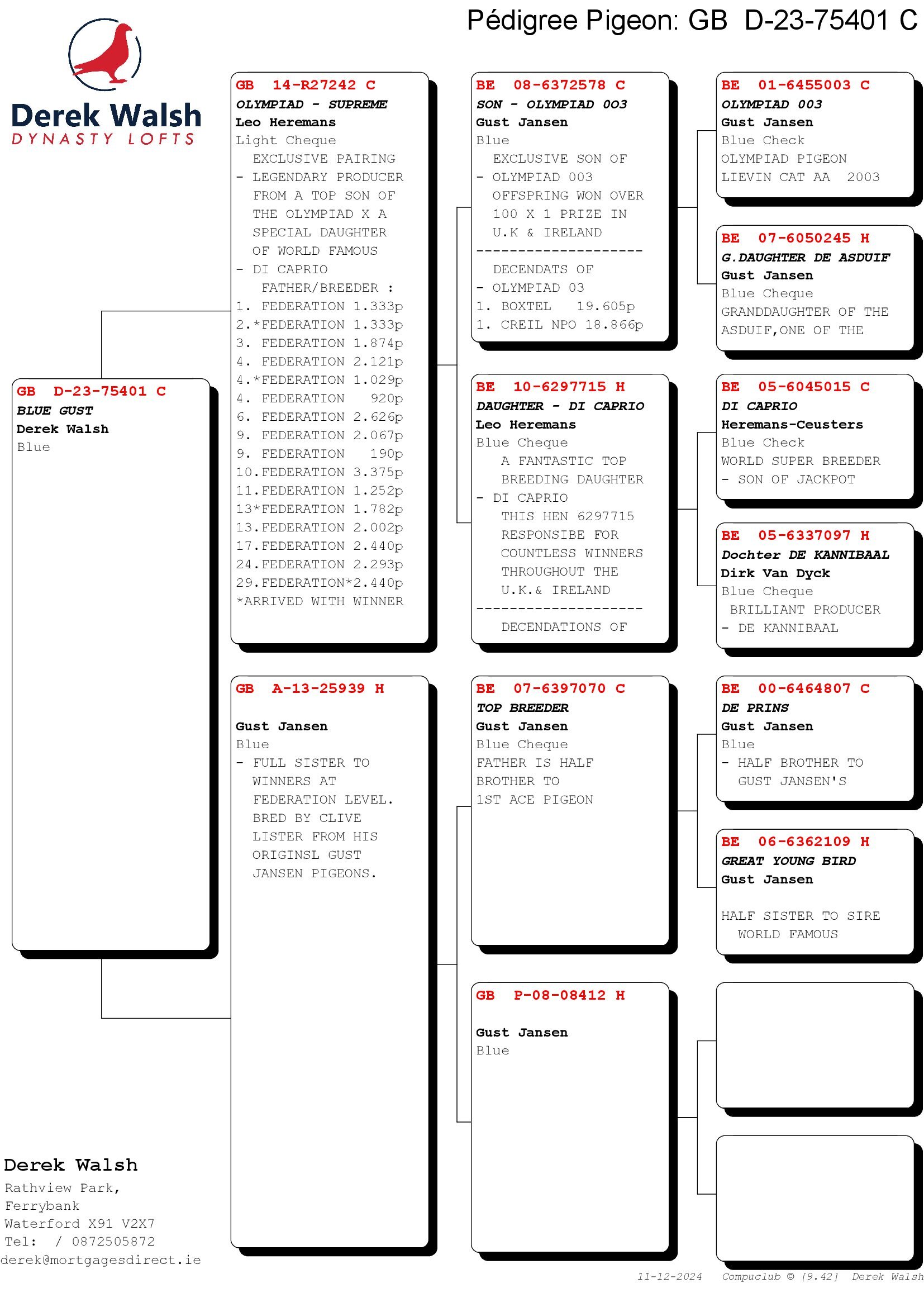 GB 23 D75401 Blue Cock “Blue Gust” He is half-brother to more than 12 top ten Fed winners. Oliver is a grandson of the Immortal Olympiad 003 and of Di Caprio.