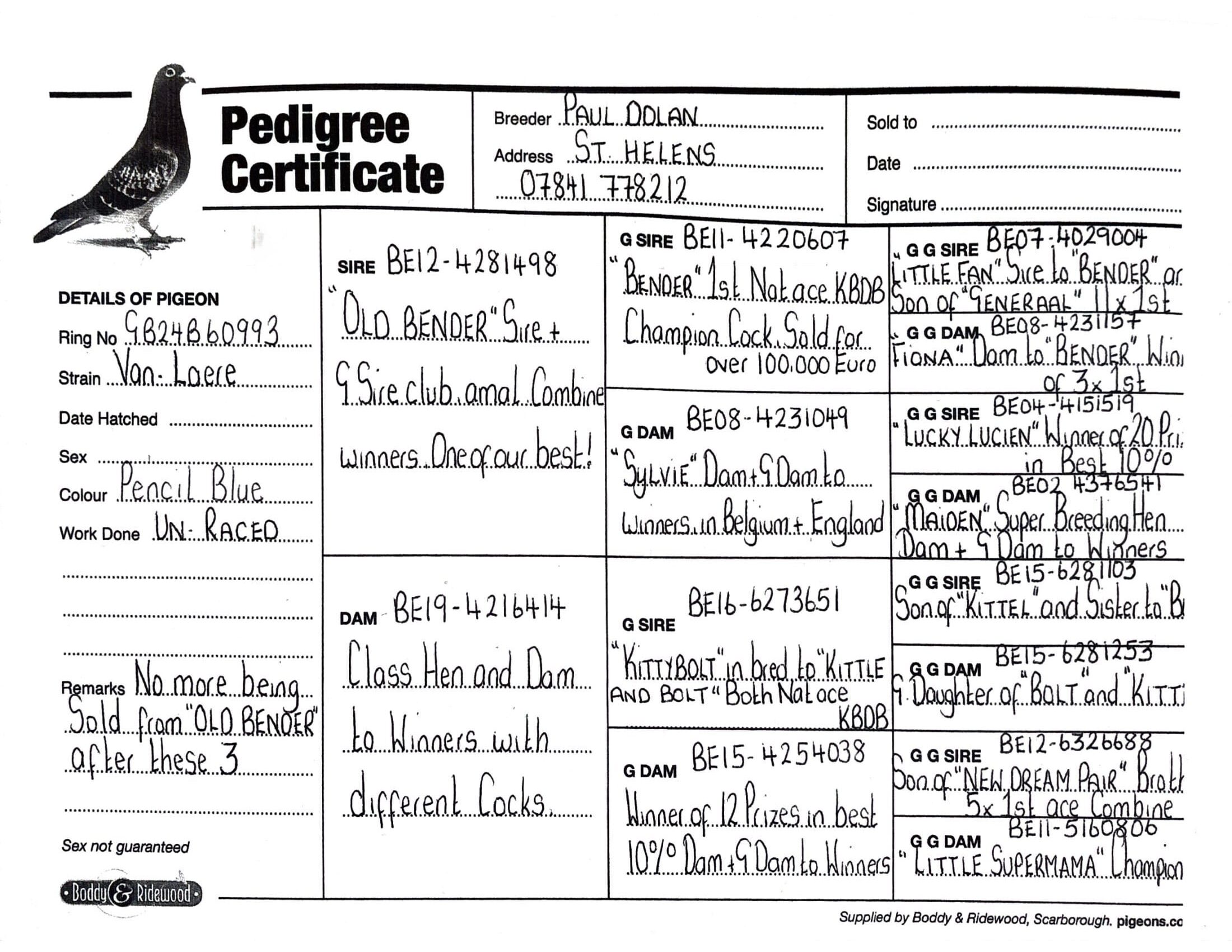 ine winners and is regarded as one of the lofts best breeders; he is a son from Bender and Sylvie. Bender was the 1st Nat Ace KBDB and sold for over 100,000 Euros. Sylvie is mother and grandmother to winners in Belgium and the UK and is a daughter from Lucky Lucien X Maiden.