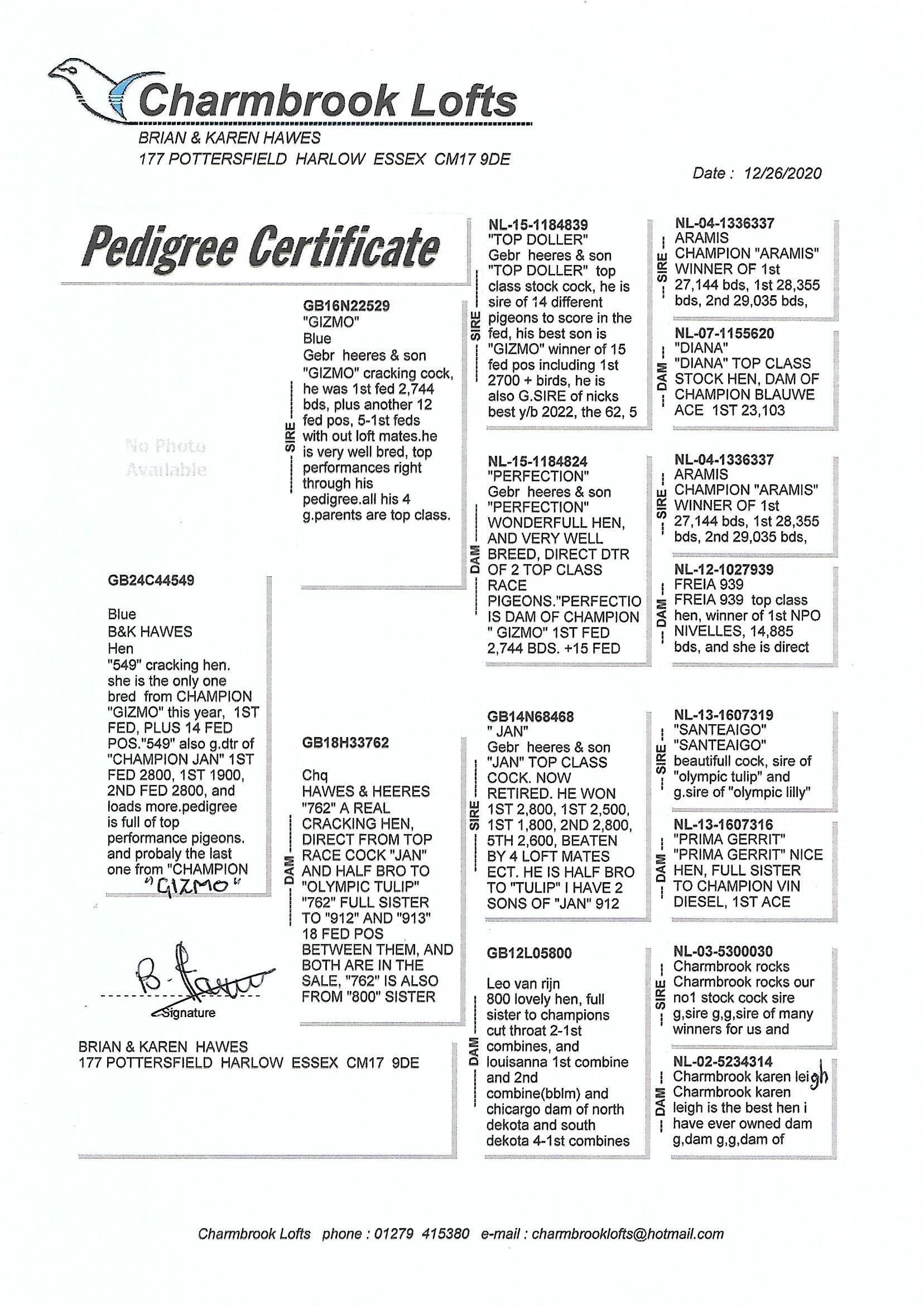 GB 16 N22529 “Gizmo” he is a winner of 1st Fed 2,744b plus another 12 top fed positions and would have won 5 X 1st feds without loft mates. Gizmo is a son of Top Dollar X Perfection, which are both direct children of Aramis, the winner of 1st 27,144b 1st 28,355b and 2nd 29,035b.