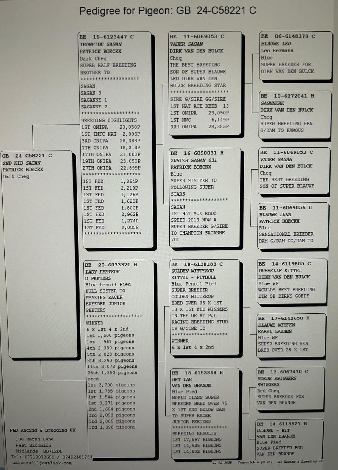 Belge 19-6123447 “Ironhide Sagan” he is a superb half brother to Sagan, the 1st Nat Ace KBDB Speed. This line have produced for P & D Stud, 1st Open NIPA 23,050b, 1st INFC 2,006b, 3rd NIPA 28,383b, 7th NIPA 18,313b, 17th NIPA 21,000b, 19th NIPA 23,050b and 27th NIPA 22,899b. this line have also produced more than 10 1st Fed winners with up to 2,962b.