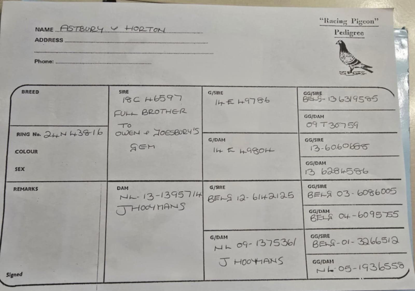NL 13-1395714 she is a Jan Hooymans hen bred from Belge 12-6142125 and NL 09-1375361