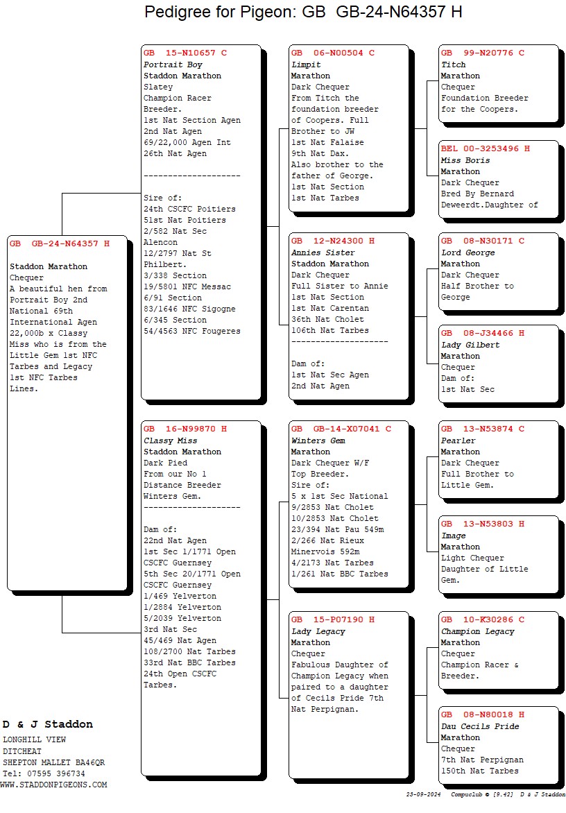 GB 15 N10657 “Portrait Boy” he is a champion breeder and racer and a winner of 1st section Agen, 2nd National Agen, 26th National Agen and 69th International Agen 22,000b. he is the father to 24th Poitiers CSCFC, 51st National Poitiers, 2nd National Alencon 582b, 12th St Philbert National 2,797b, 3rd section 338b, 19th NFC Messac 5,801b, 6th section 91b, 83rd NFC Sigogne 1,646b and 6th section 54th National Fouigeres 4,563b.