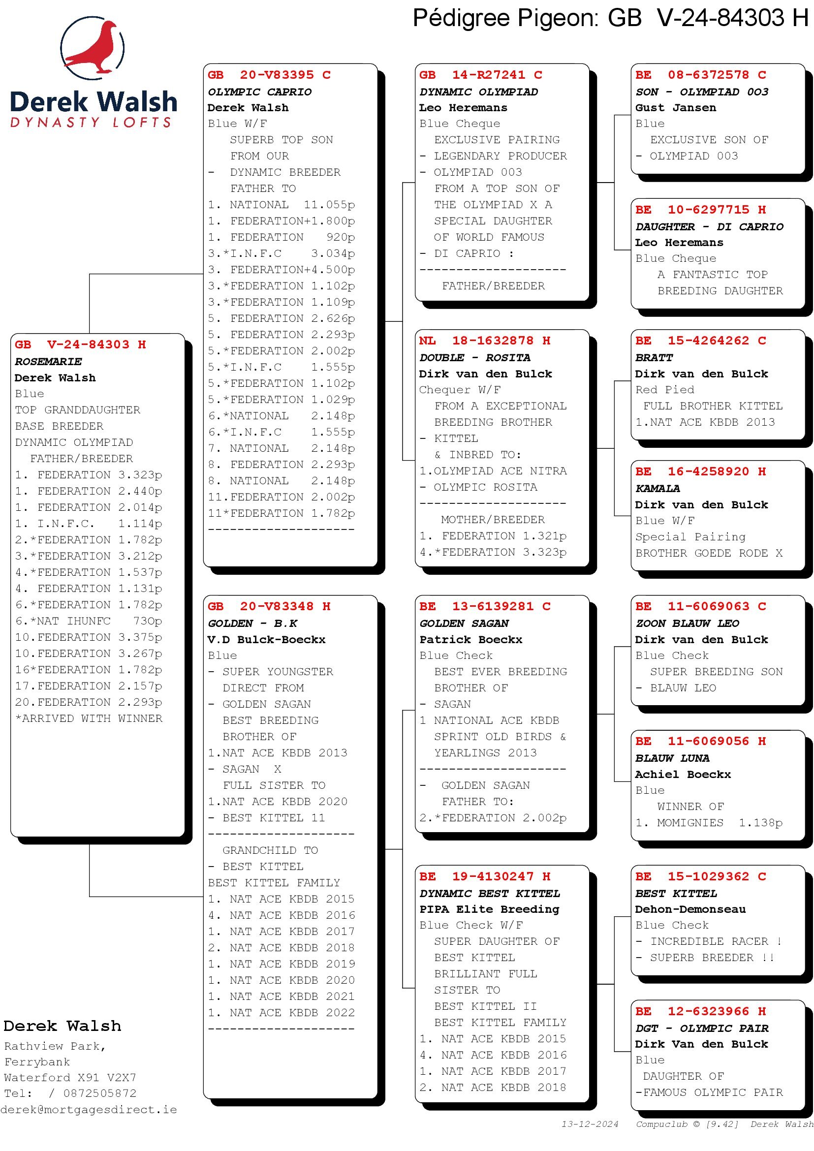 GB 24 V84303 Blue Hen “Rosemarie” she is a granddaughter from the base breeders Dynamic Olympiad, Double Rosita, Golden Sagan and Dynamic Best Kittel.