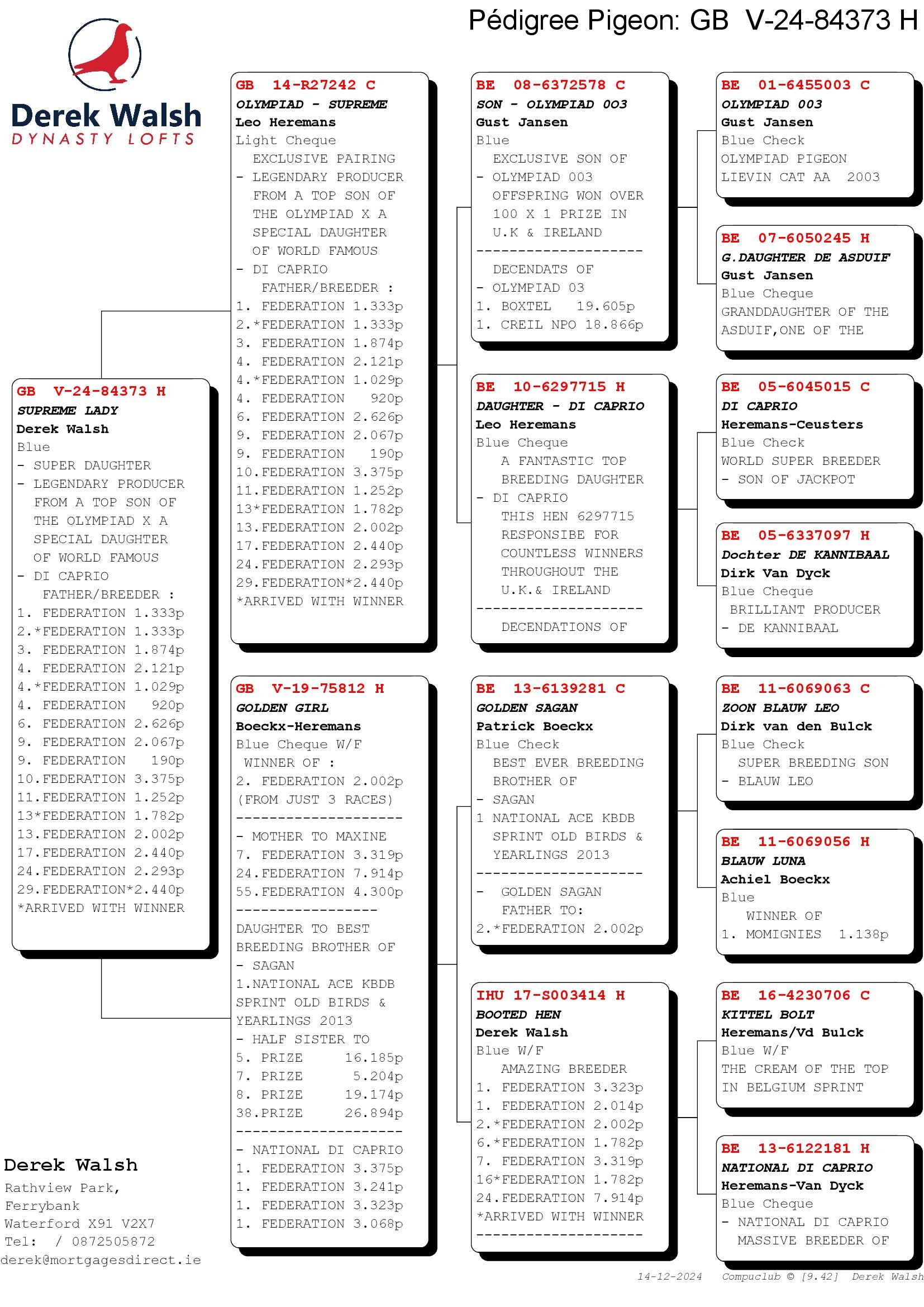 GB 14 R27242 “Olympiad Supreme” he is from the exclusive pairing of Son Olympiade 003 X Daughter Di Caprio. Descendants have won 1st Fed 3,323b, 1st Fed 2,440b, 1st Fed 2,014b, 2nd Fed to loft mate 1,782b, 3rd Fed to loft mates 3,212b, 4th Fed to loft mates 1,537b, 4th Fed 1,131b, 6th Fed to 5 loft mates 1,782b, 6th National IHUNFC 730b, 10th Fed, 10th Fed, 16th Fed, 17th, 20th and 27th Fed winners.