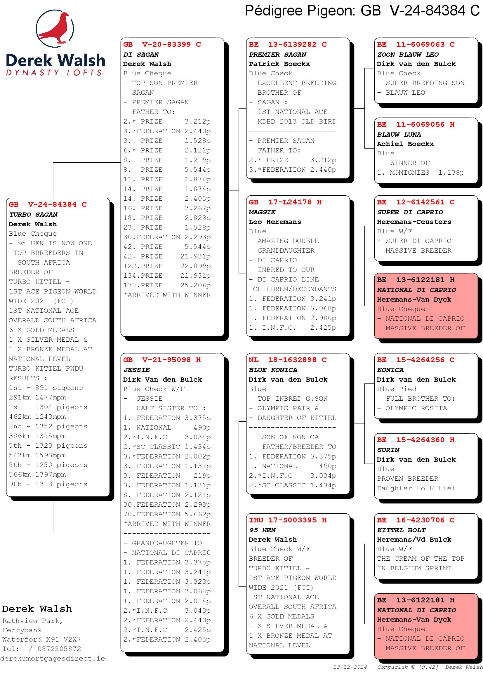 Turbo Kittel Results: 1st 891b 291km doing 1477metres per minute, 1st 1,304b 462km 1243 metres per minute, 2nd 1,352b 386km 1385 metres per minute, 5th 1,323b 543km 1593 metres per minute, 8th 1,250b, 566km 1397 metres per minute, 9th 1,313b 530km 1338 metres per minute, 10th 1,272b 580km 1248 metres per minute and 15th 1,295b 487km and 1338 metres per minute. She is also half-sister to 1st Fed 3,375b, 1st National 490b, 2nd INFC 3,034b behind loft mate, 3rd Fed 2,002b, 3rd Fewd 1,131b, 3rd Fed 219b, 3rd Fed 1,131b, 8th Fed 2,121b, 30th Fed 2,293b and 70th Fed 5,662b.