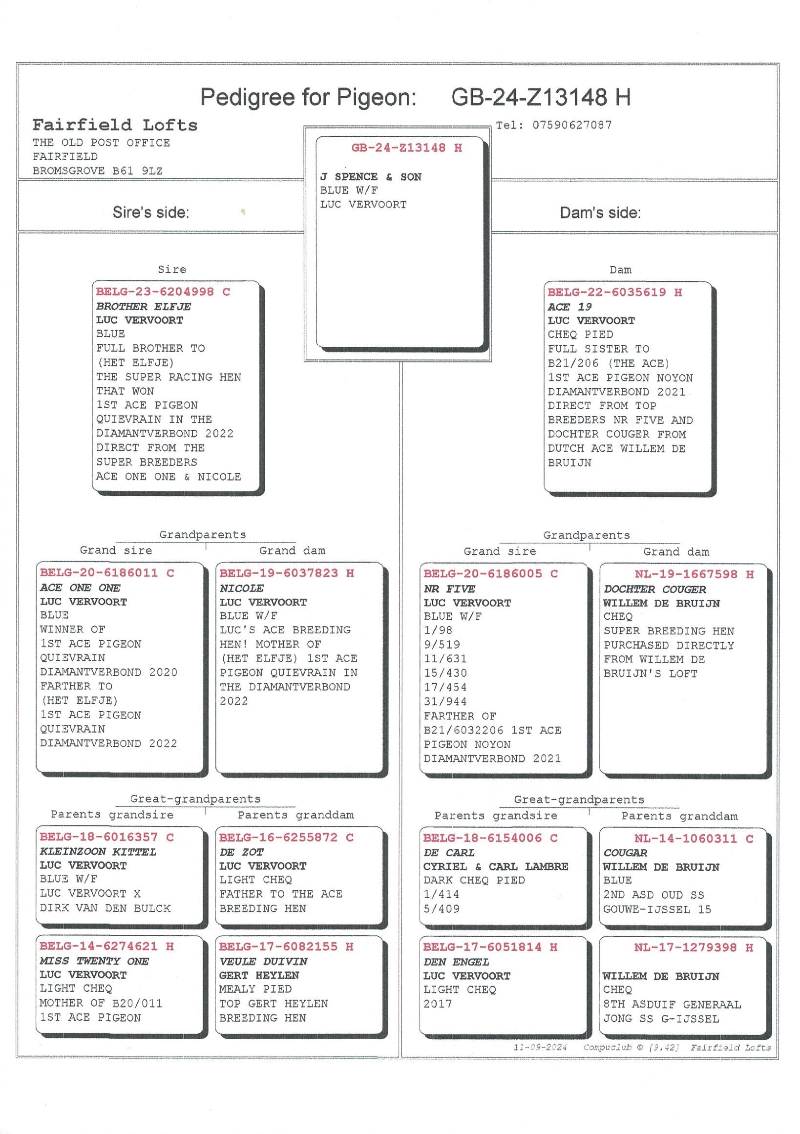 Belge 22-6035619 “Ace 19” she is a full sister to “The Ace” the winner of 1st Ace Pigeon Noyon Diamantverbond 2021, The Ace is the father to “Elfje Junior” the winner of 1st Ace Pigeon Quievrain 2024 when he was paired with Het Elfje. The parents to 6035619 are Nr Five X Willem De Bruijns daughter of Couger.