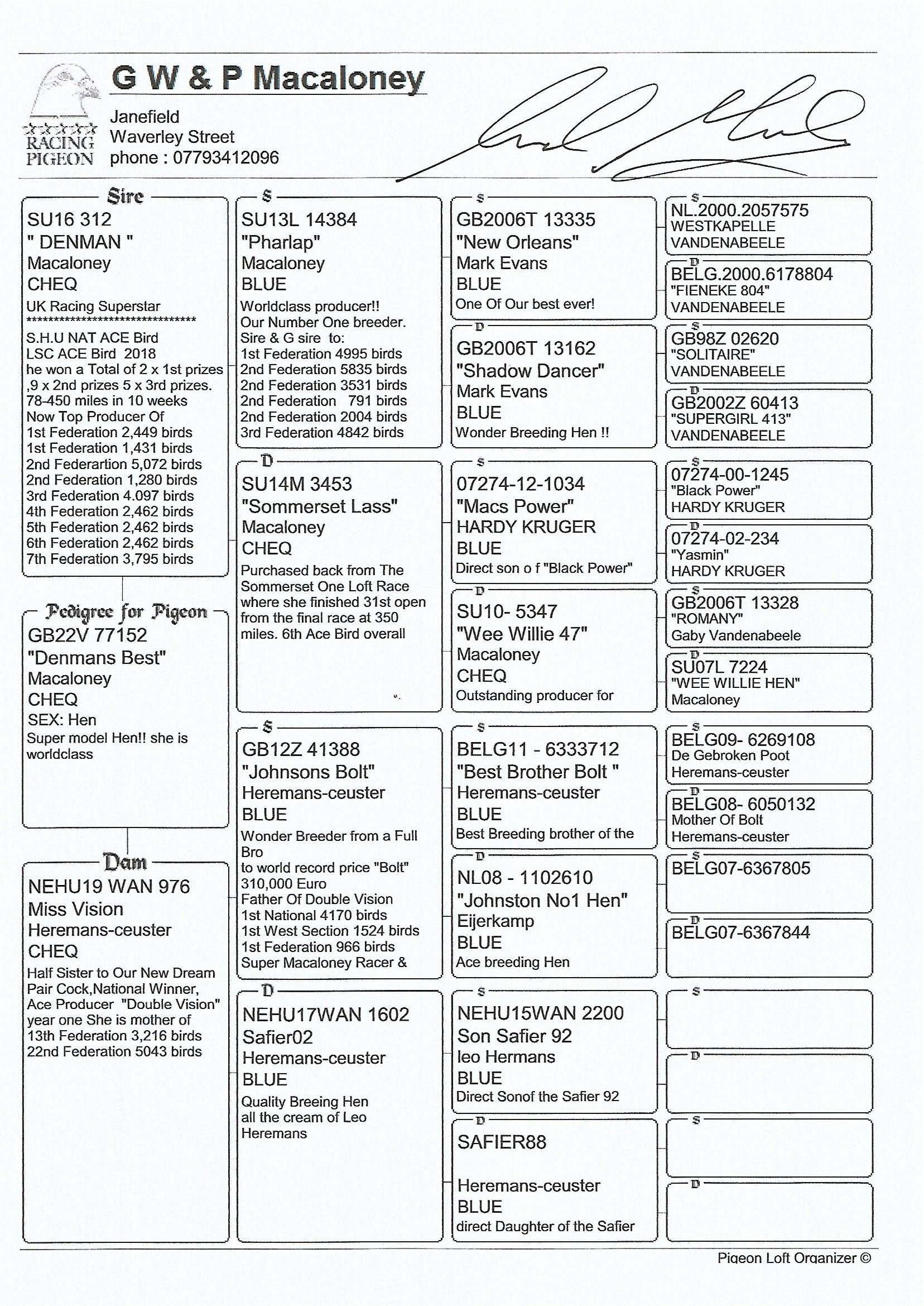 Superb daughter of racing machine Denman, this hen is of top quality, handles like a dream and like many of her half siblings sure to be a hit in the breeding loft.